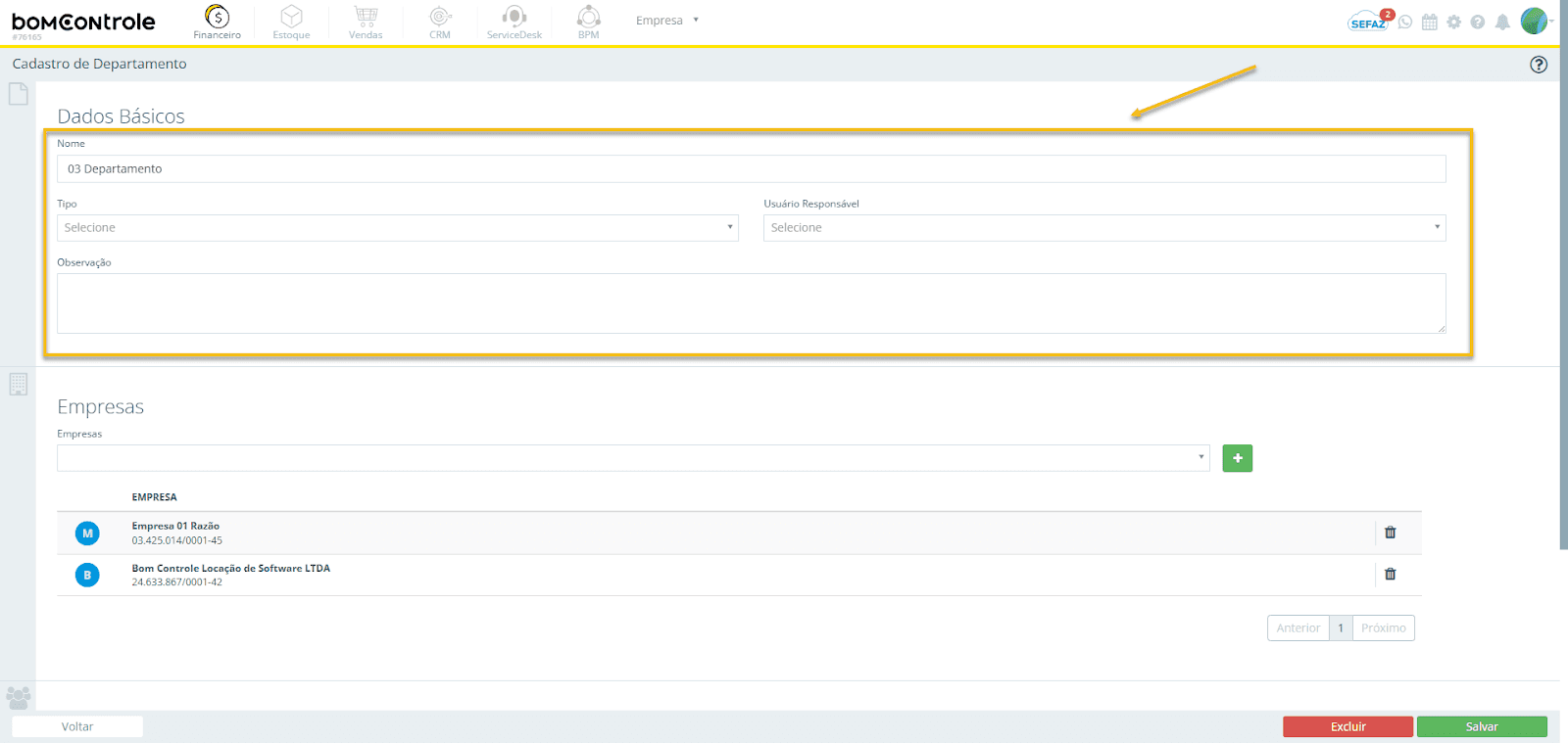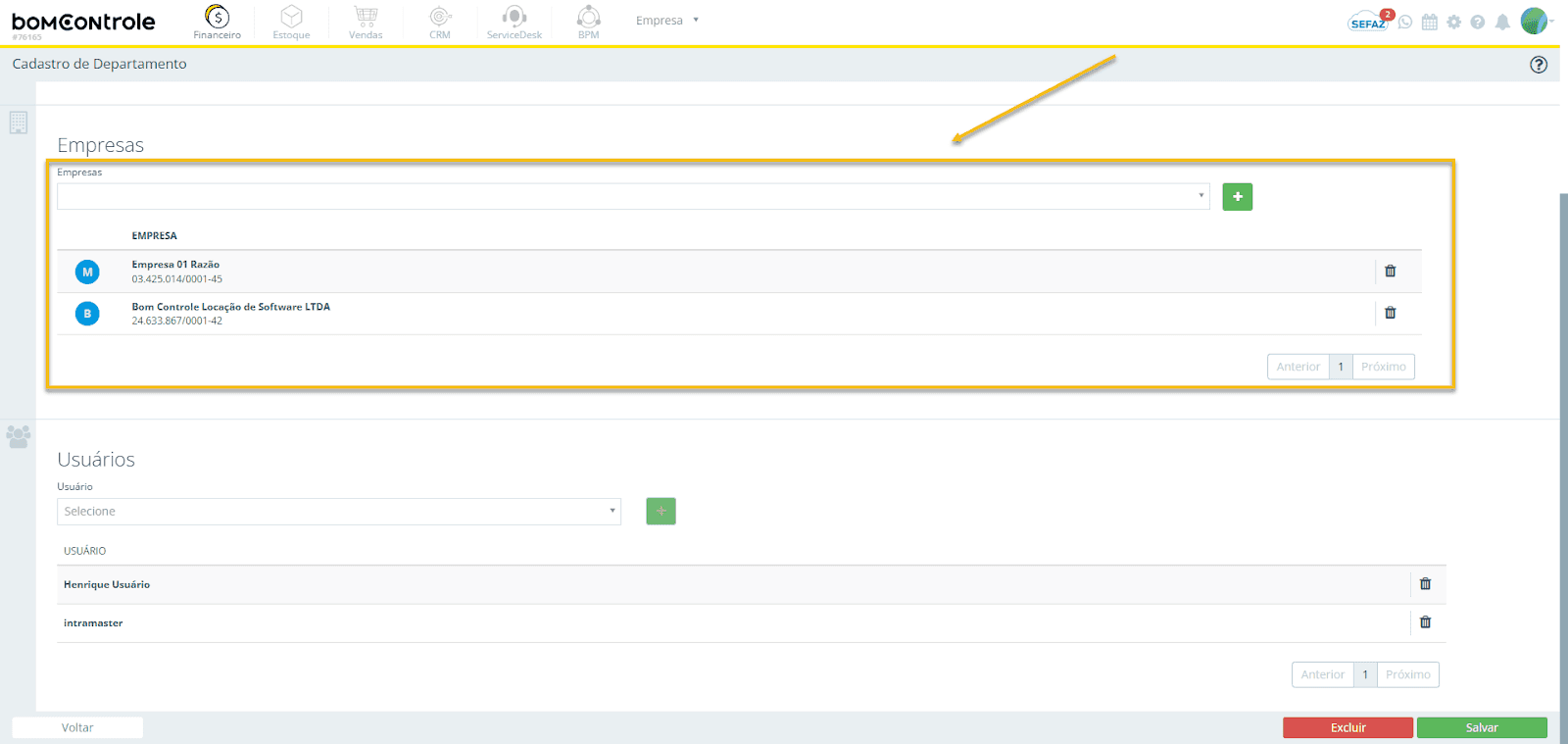 Figura 2 — Empresas vinculadas (seção de empresas do cadastro de Departamento)