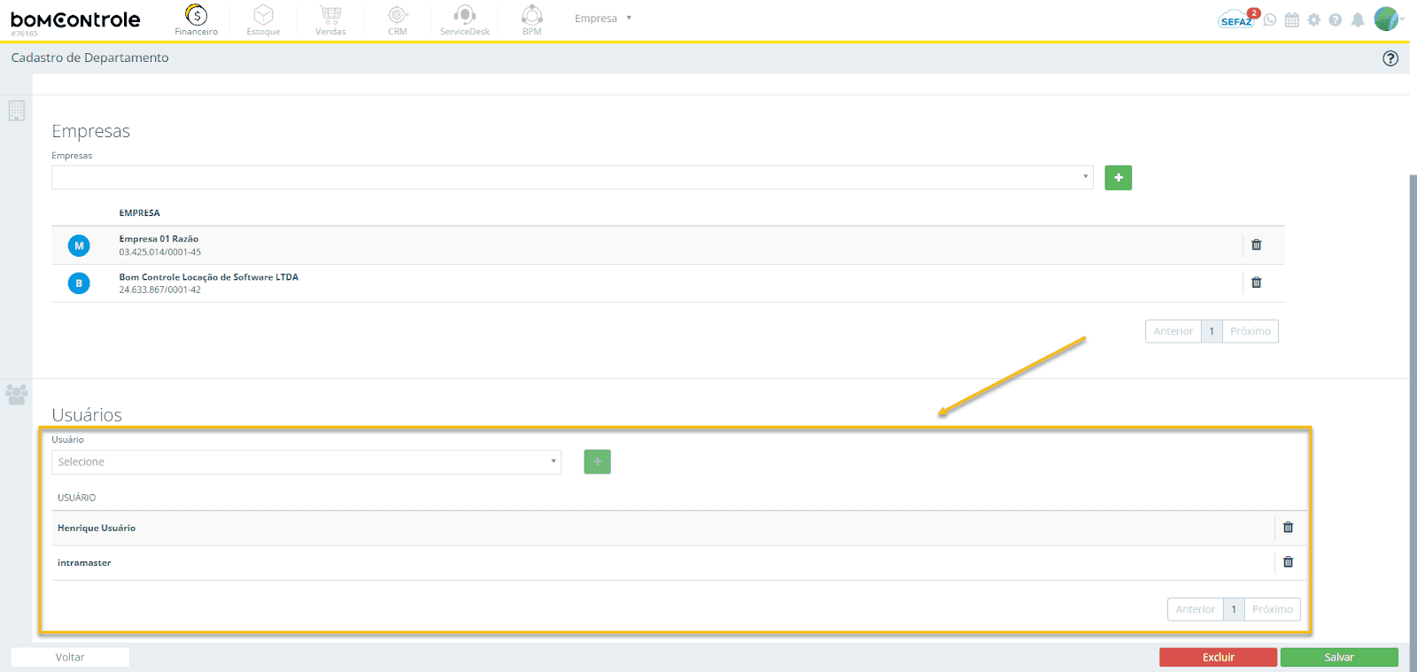 Figura 3 — Usuários do Departamento (seção de usuários do cadastro de Departamento)