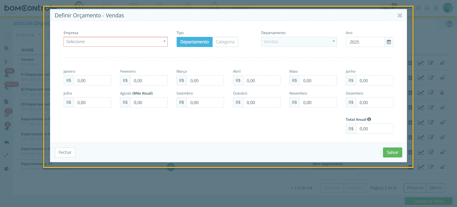 Para acessar a tela de cadastro de departamento no BomControle:
