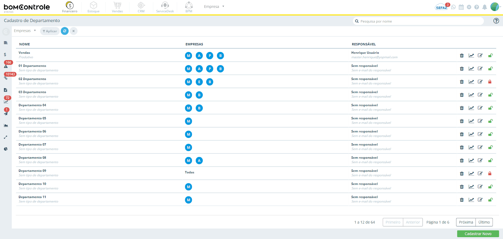 A tela de listagem será exibida com os departamentos já cadastrados. Use o botão Cadastrar novo para incluir um novo registro ou o ícone de lápis (editar) para modificar um item existente.