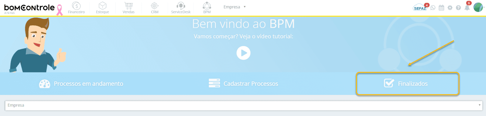 Função: Ao clicar em Finalizados, o sistema abre a tela de listagem de processos finalizados (menu BPM > Dia a Dia > Processos Finalizados). Nessa tela, você consegue ver todos os processos de negócio que já foram concluídos, seja com sucesso (finalizados aprovados/concluídos) ou encerrados sem aprovação (processos reprovados ou cancelados). É um atalho útil para consultar o histórico de processos encerrados, permitindo, por exemplo, localizar um processo específico já concluído para verificar detalhes de execução ou resultado final.
