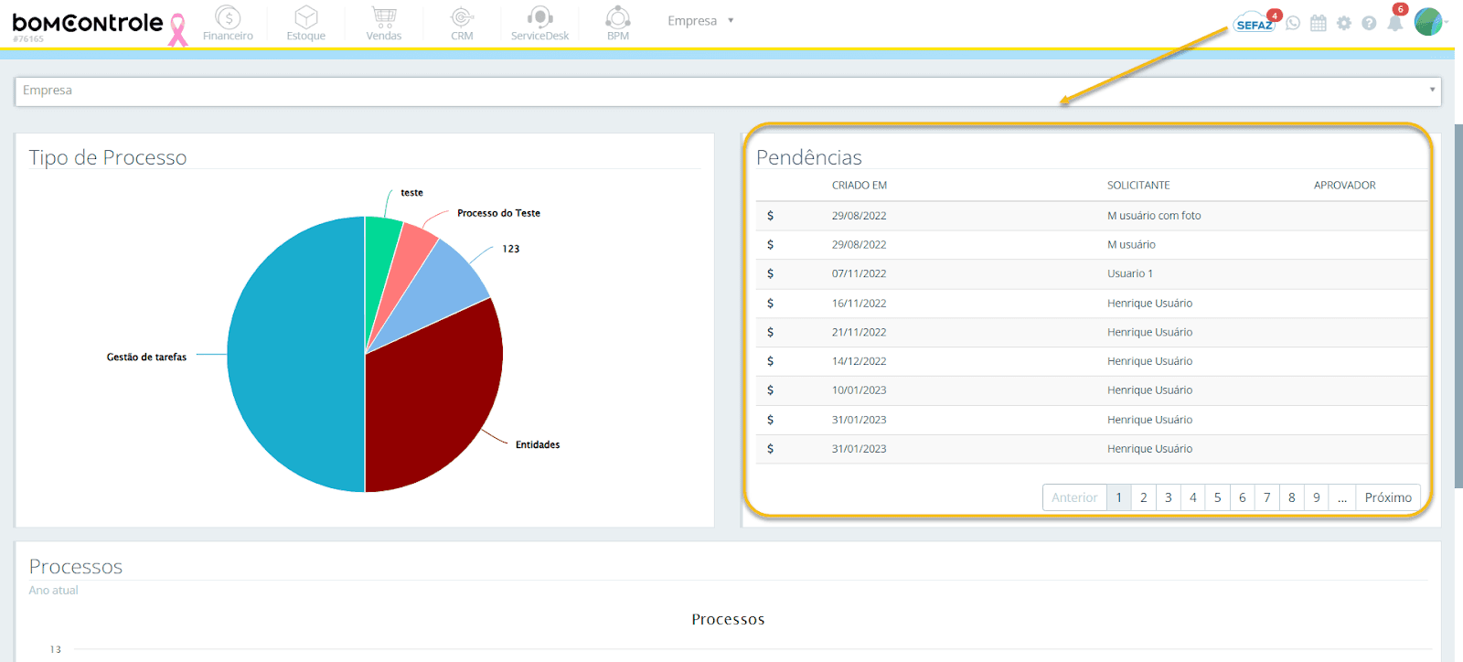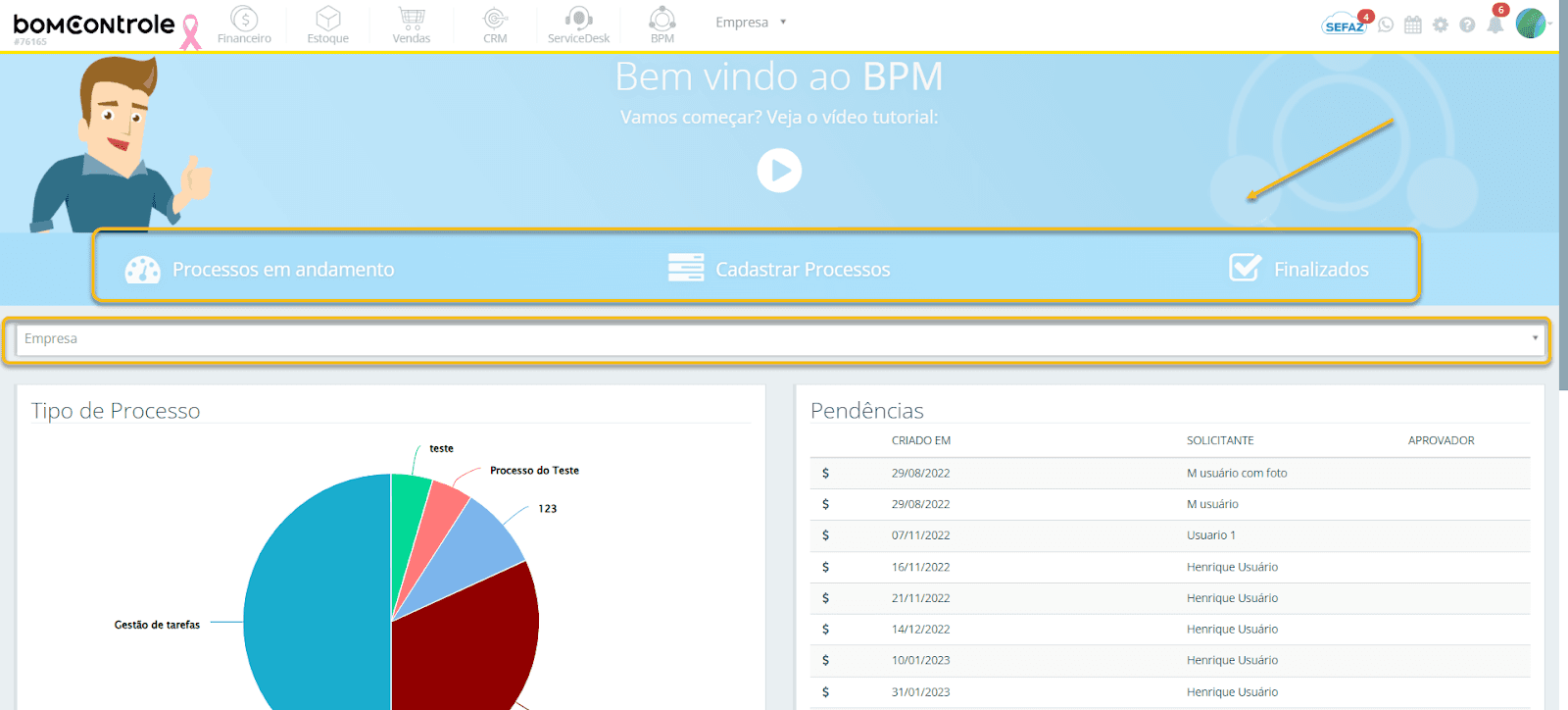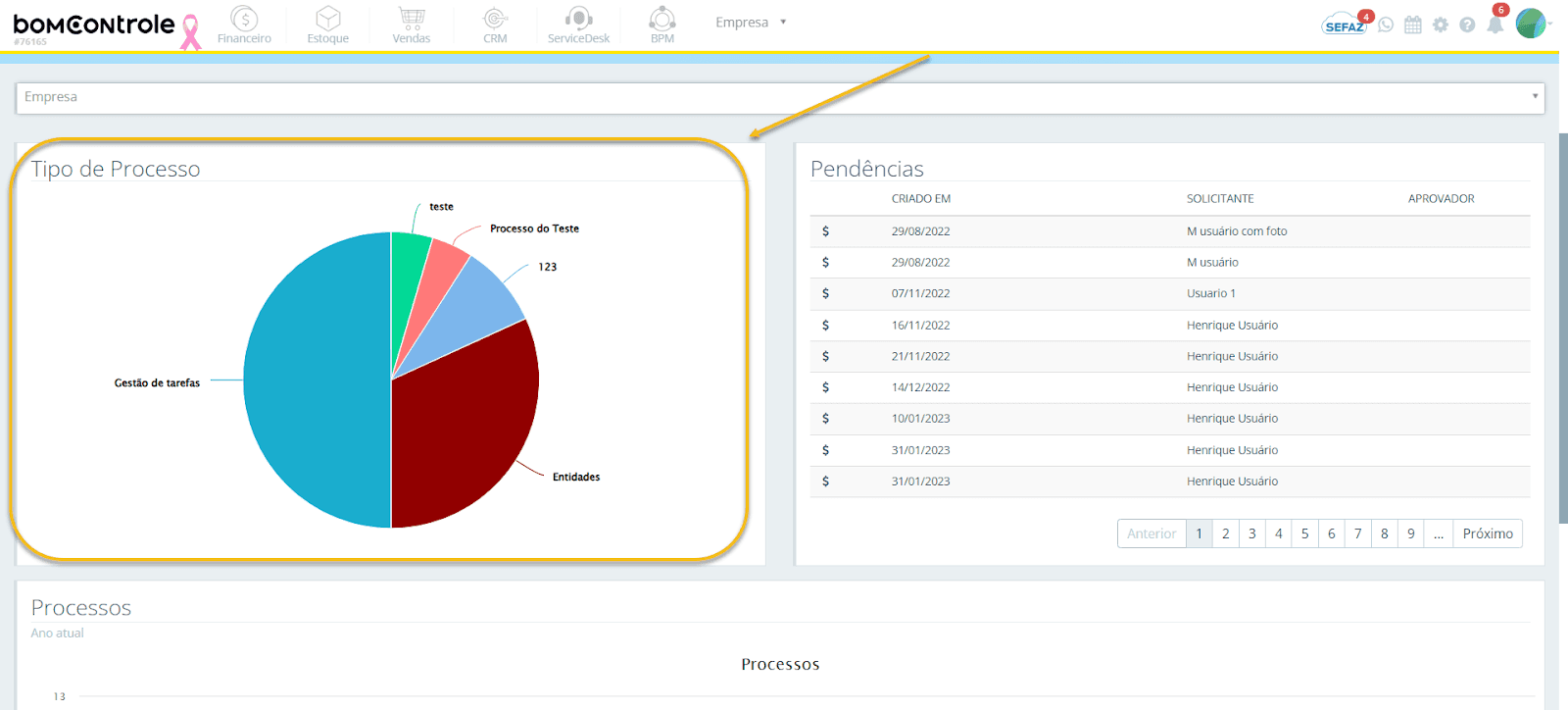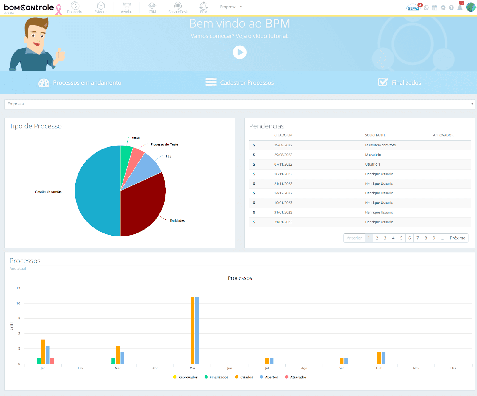 O Dashboard BPM do BomControle reúne em uma única tela diversos indicadores fundamentais para o acompanhamento dos processos internos da empresa. Usando o filtro de Empresa, o usuário pode focalizar a análise na unidade desejada, obtendo uma visão personalizada dos dados. Cada seção – Tipo de Processo, Pendências, Evolução Mensal de Processos – oferece uma perspectiva diferente, porém complementar, sobre a operação do BPM.