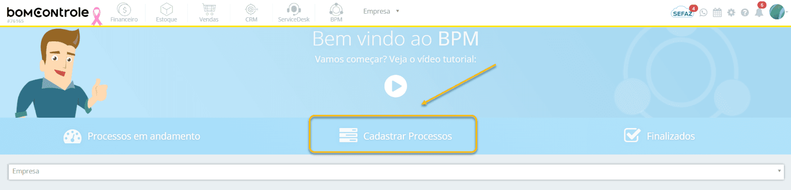 Impacto em outros módulos: Não há impacto direto em outros módulos ao clicar neste botão – trata-se de uma ação de navegação dentro do módulo BPM. Entretanto, o cadastro de processos em si é fundamental para todo o sistema: os processos definidos servirão de base para fluxos de trabalho que podem envolver outros módulos. Por exemplo, você pode ter um processo de aprovação de crédito que interaja com o Financeiro ou um processo de atendimento que se relacione ao CRM. Assim, embora o ato de clicar no botão não altere nada em outros módulos, os processos que você criar podem, quando executados, interagir com diversos setores e módulos do BomControle conforme seu desenho.