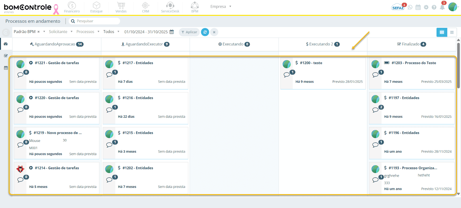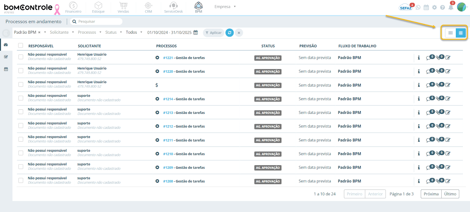 Na visão de lista, o Status daquela linha mudará de “Ag. Aprovação” para “Ag. Execução”, por exemplo.