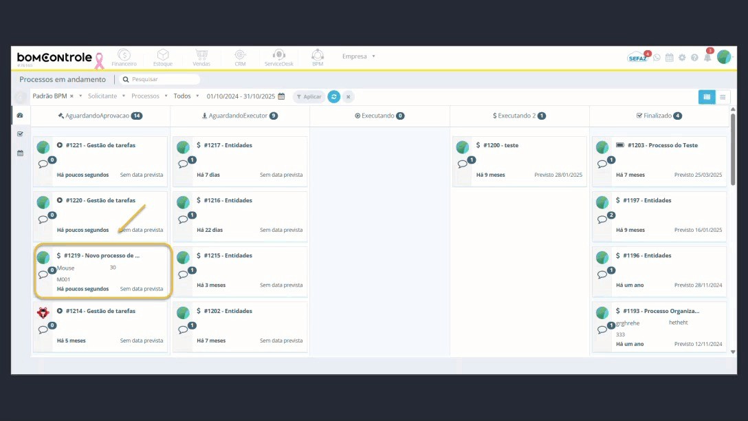 Se você estiver observando o painel Kanban, poderá ver o card “andar” para a próxima coluna automaticamente quando alguém realiza a ação. Ex.: seu processo saiu de Aguardando Aprovação e foi para Aguardando Execução assim que o gerente aprovou.