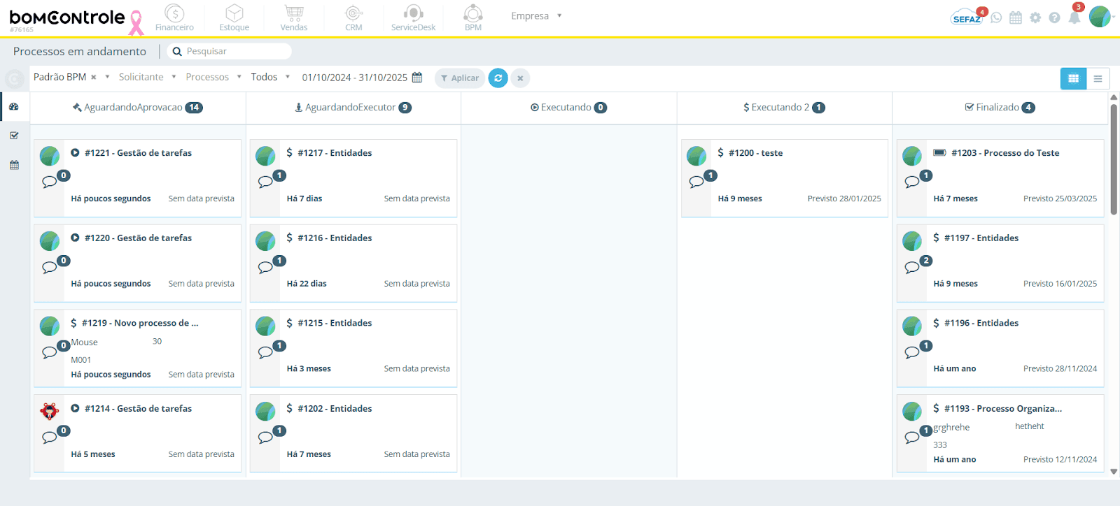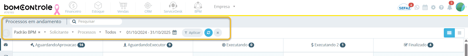 Fluxo de Trabalho: um menu suspenso para selecionar o fluxo de trabalho BPM desejado. Se a sua empresa possui múltiplos fluxos (diferentes categorias ou conjuntos de processos), você deve selecionar qual fluxo deseja visualizar. Este filtro é fundamental – por padrão o BomControle já seleciona o fluxo de trabalho padrão da empresa. Caso queira ver processos de outro fluxo, escolha-o na lista. Somente processos pertencentes ao fluxo selecionado serão exibidos. (Ex.: Fluxo de Compras, Fluxo de Vendas, etc.)