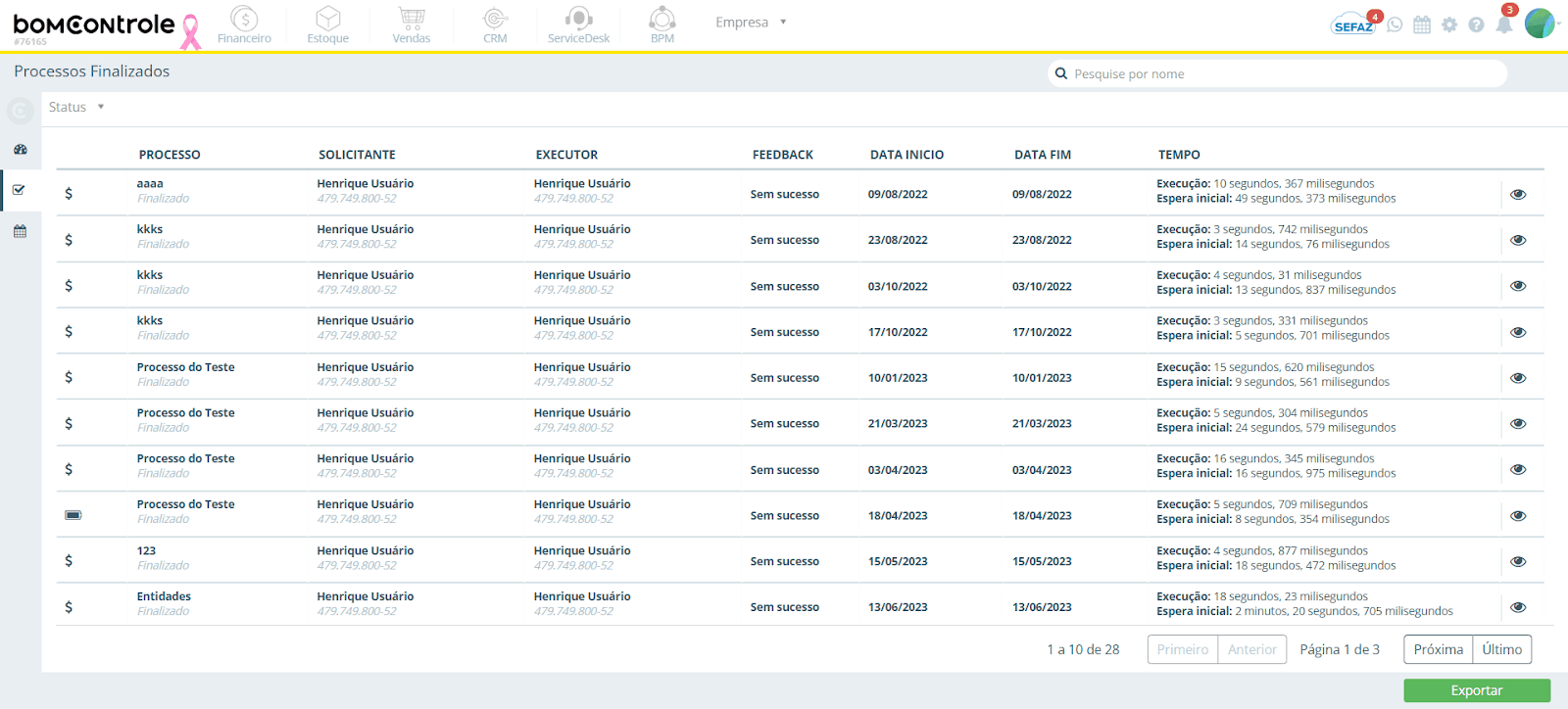 Executor: o nome do usuário executor/responsável final que concluiu o processo. Em muitos fluxos, é a pessoa ou equipe que executou a última etapa. Por exemplo, em um processo de compra, o executor final pode ser alguém do departamento de compras que fechou o processo. Abaixo do nome, mostra o documento desse usuário ou indica se não está cadastrado. Se o processo terminou cancelado ou reprovado, pode ser que não haja “executor” propriamente dito – nesse caso, possivelmente o aprovador ou quem cancelou aparece como responsável final. De todo modo, esta coluna aponta quem deu o desfecho.