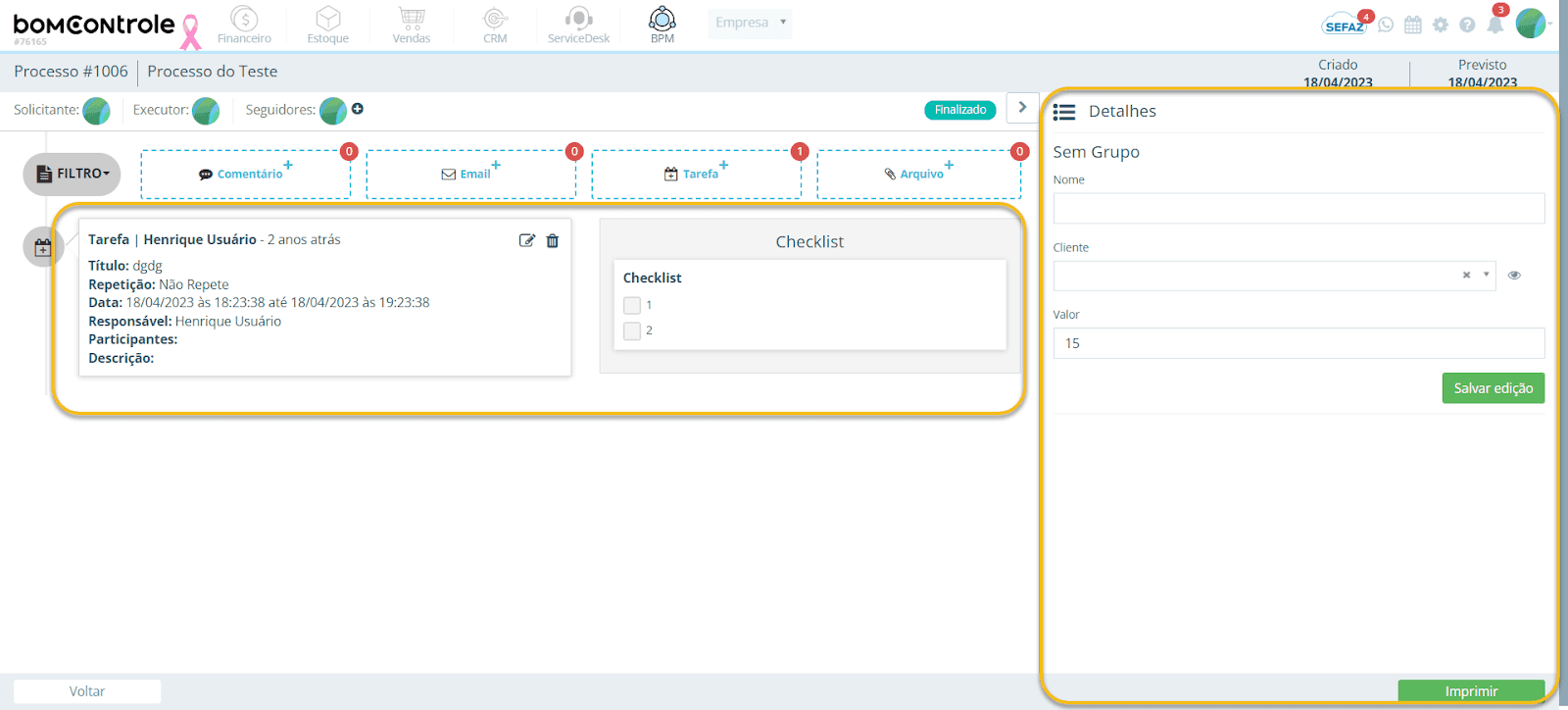 Checklist/Resultados: se o processo tinha checklist ou tarefas internas em etapas, você pode ver quais itens foram marcados.