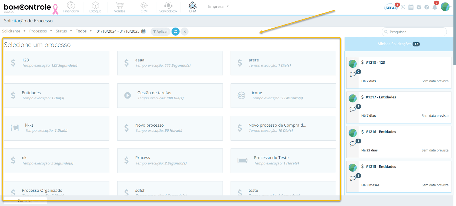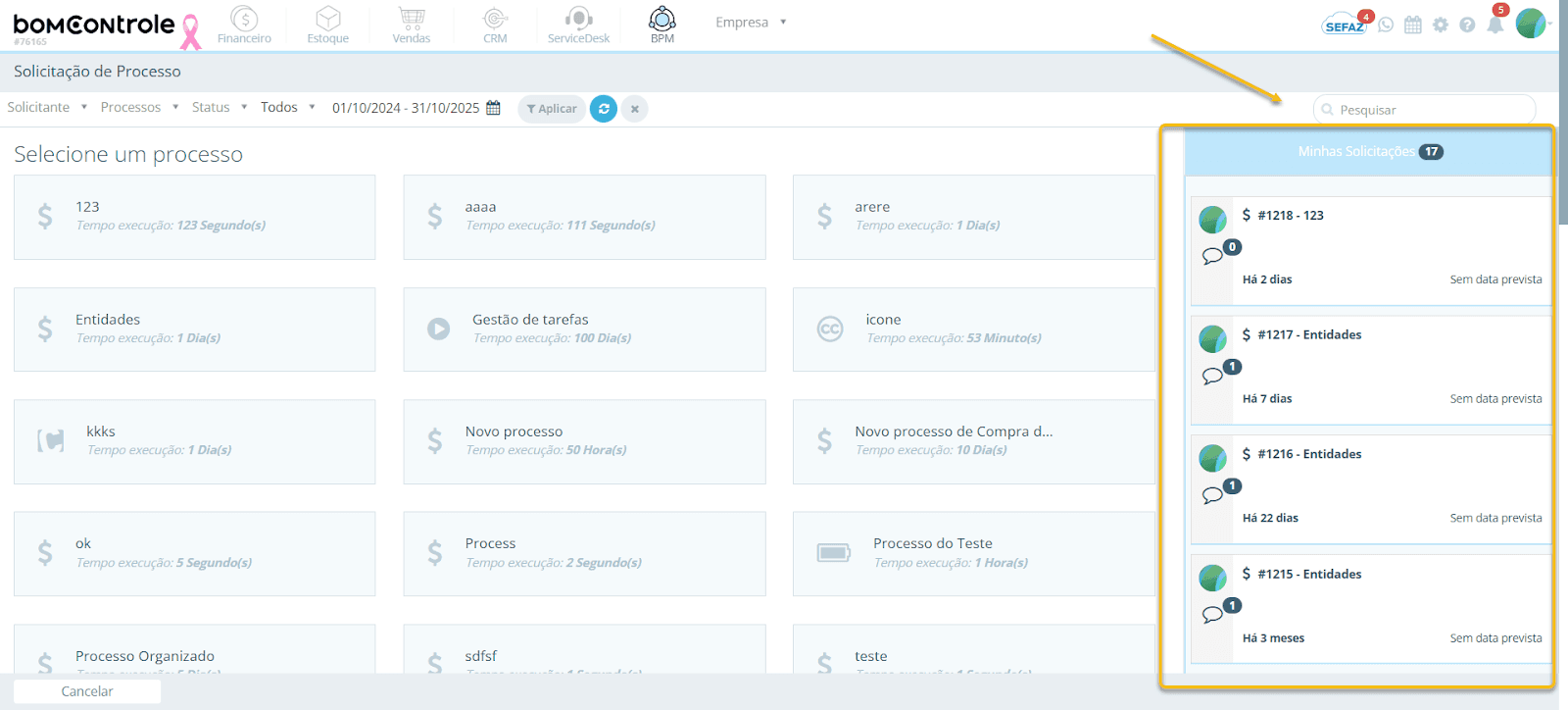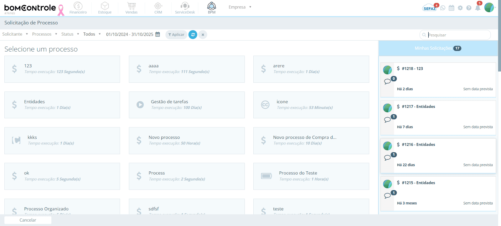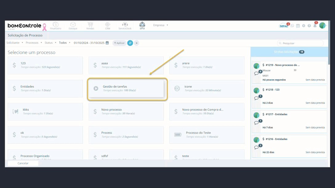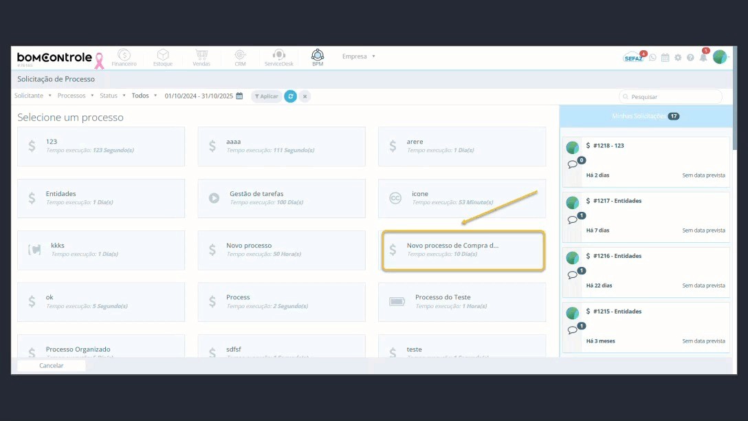 Este manual tem como objetivo orientar o usuário final no uso da funcionalidade Solicitação de Processo no módulo BPM do BomControle, de forma simples e detalhada. Será explicado como acessar a tela de solicitação de processo, como utilizar os filtros de pesquisa, como interpretar as informações exibidas nos cards de solicitações e como iniciar um novo processo preenchendo todos os campos corretamente. Também serão descritos os impactos da criação de uma solicitação de processo dentro do BPM (e em outros módulos, se aplicável), incluindo um exemplo prático para facilitar o entendimento.