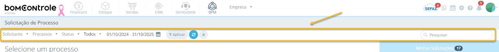 Para acessar a tela de Solicitação de Processo no BomControle: