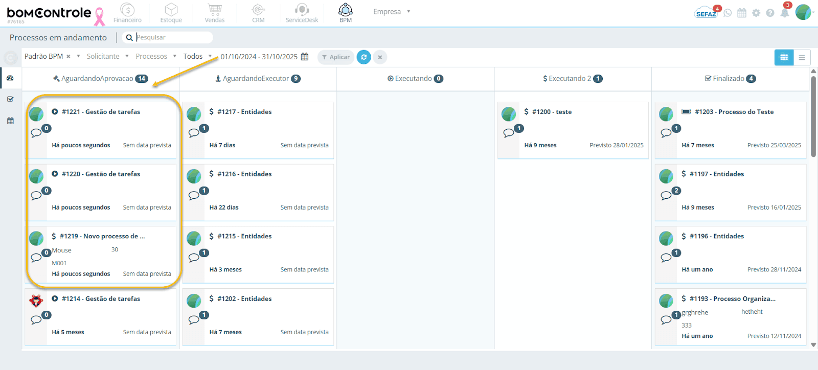 Status do processo: um menu suspenso que permite filtrar as solicitações pelo status atual no fluxo BPM. Por exemplo, você pode escolher visualizar Aguardando Aprovação, Aguardando Execução, Em Execução ou Finalizados. Selecionando um status específico, a listagem exibirá somente os processos que estejam naquele estágio. O valor Todos mostra processos em qualquer status (exceto, geralmente, os finalizados, que podem ser acessados em outra tela de histórico).
