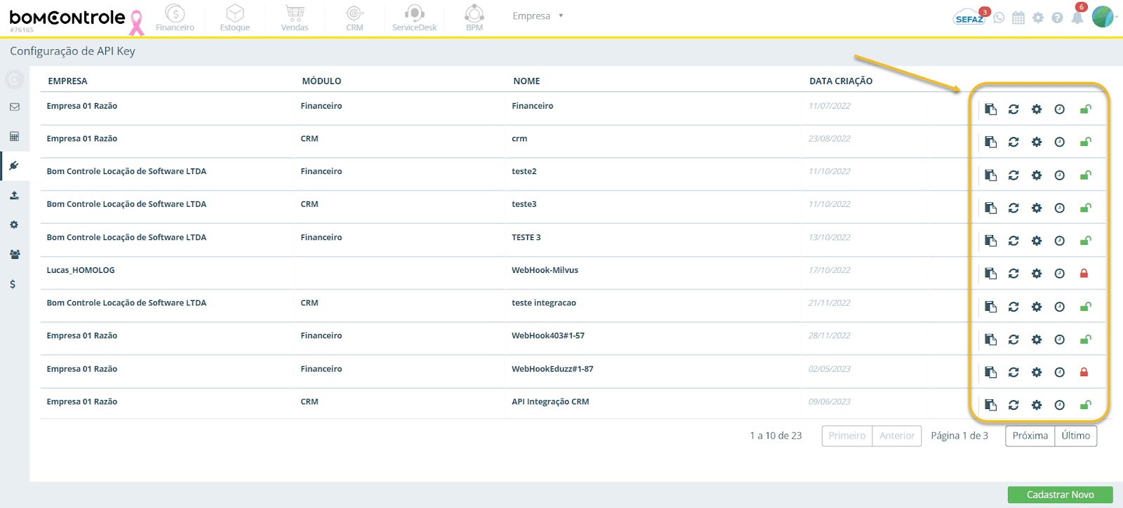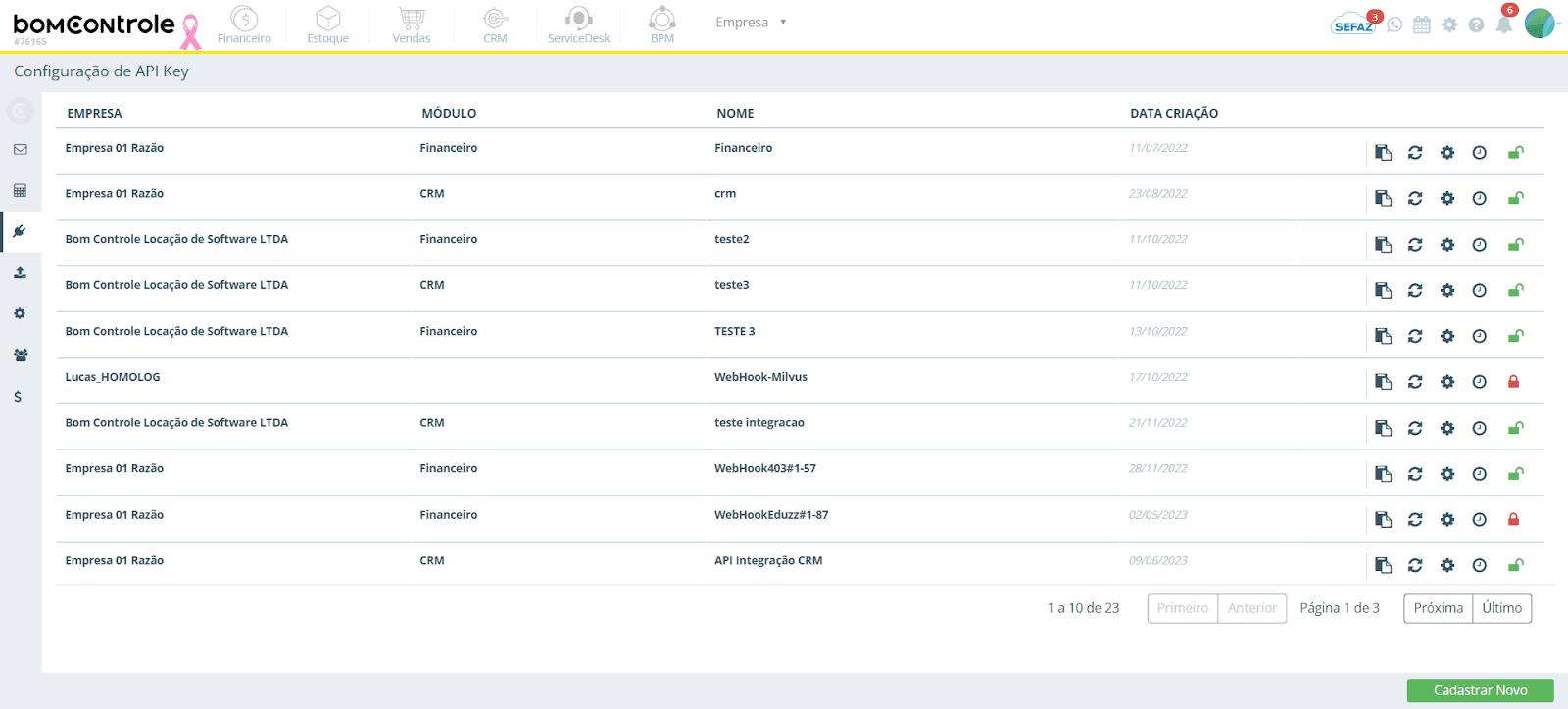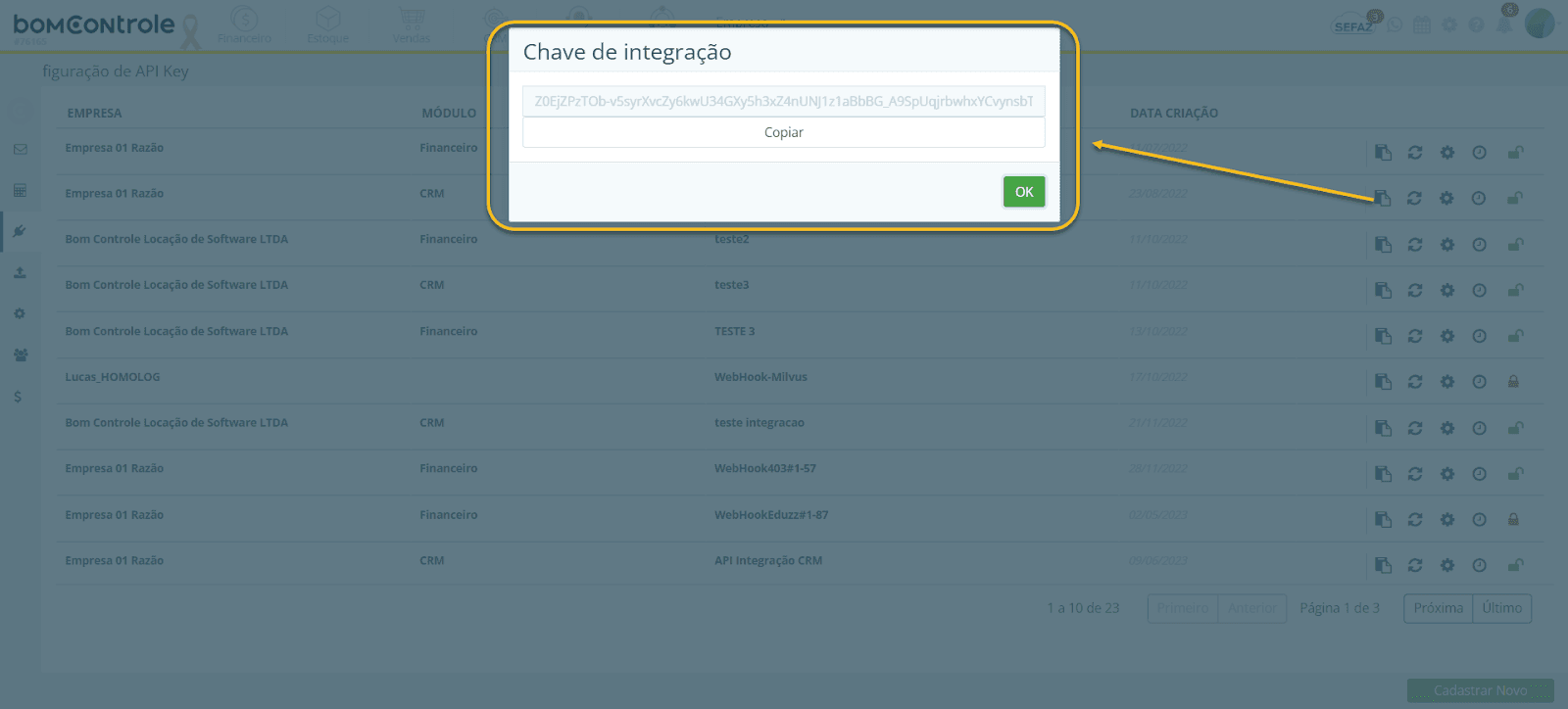 Considerações finais: Uma vez criada a API Key, use os botões da listagem para gerir sua utilização: - Copiar a chave e configure-a no sistema externo que fará as requisições à API do BomControle. - Bloquear a chave se precisar interromper o acesso (por exemplo, em caso de mudança de parceiro ou suspeita de vazamento da chave).