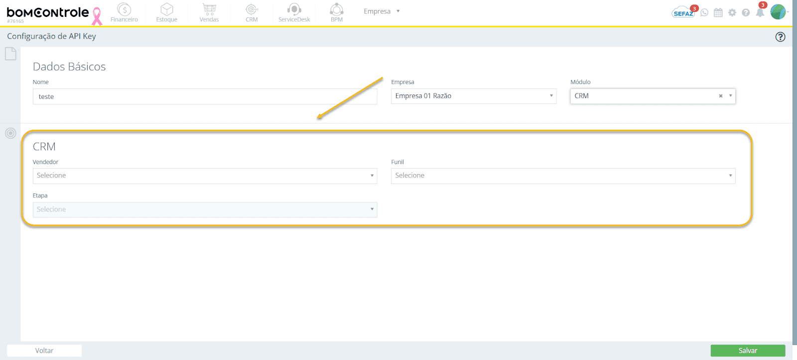 Figura 6 — Seção de configurações CRM no cadastro de API Key.