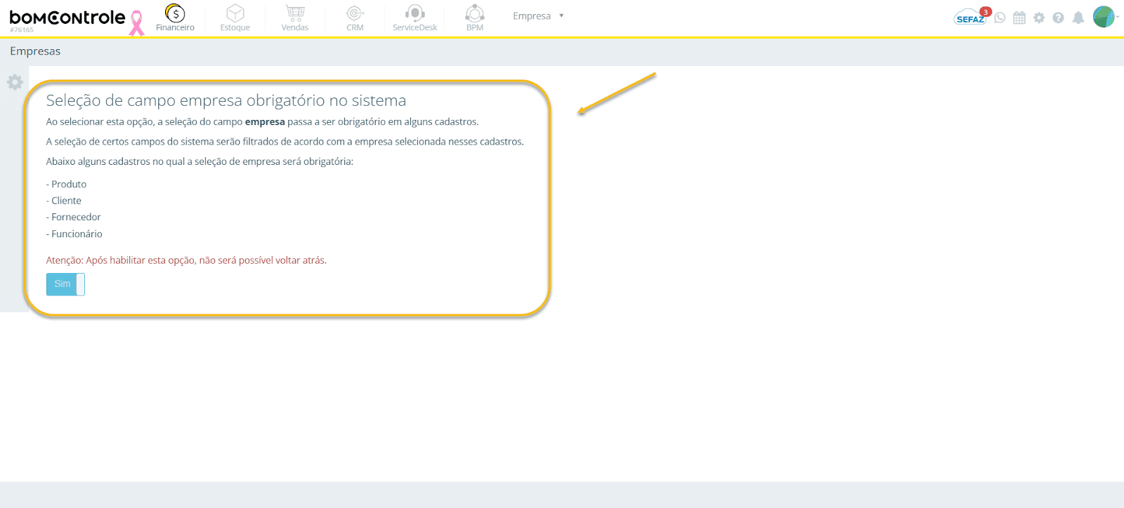 Seleção de campo empresa obrigatório no sistema: ✅ Campo opcional (toggle). Trata-se de uma opção do tipo liga/desliga (Sim/Não) que define se o BomControle deve exigir a seleção de uma empresa em todos os lançamentos e registros do sistema. Por padrão, vem desativada (“Não”). Marque “Sim” para habilitar o modo multi-empresa. Ao ativar esta opção, a mudança é salva automaticamente e entra em vigor imediatamente – uma vez ativada, não é possível desativá-la novamente. Confirme a decisão ao habilitar, pois o sistema pode exibir um aviso do tipo “Após habilitar essa opção, não será possível voltar atrás.”