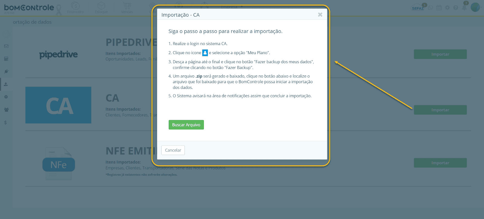 Importar no BomControle: De volta ao BomControle, na tela Configurações > Importação de Dados, localize a seção CA (ContaAzul) e clique no botão Importar. Será aberto um modal solicitando o arquivo de backup.