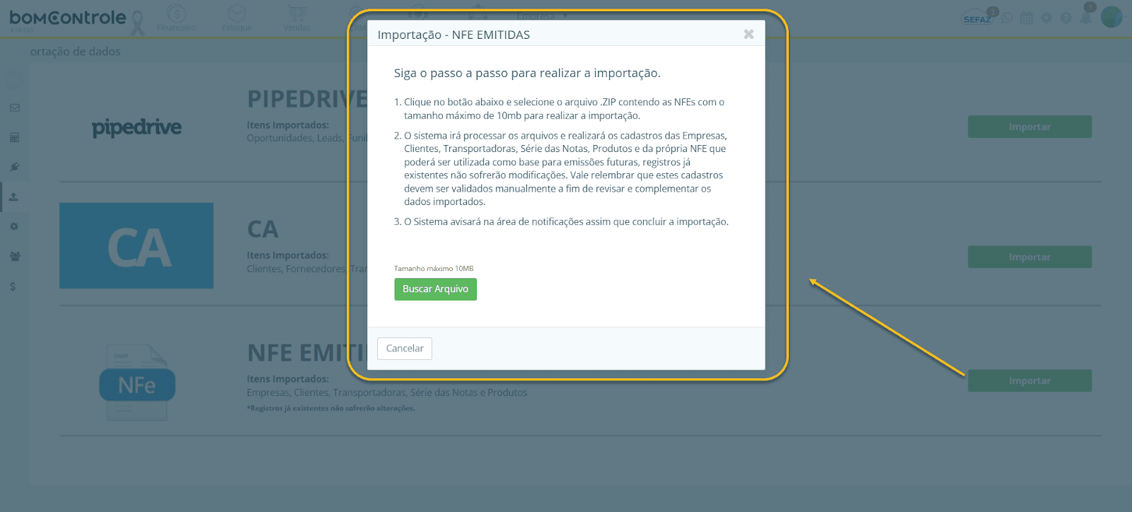 Importar no BomControle: Na tela Importação de Dados, seção NFE Emitidas, clique em Importar. No modal que abrir, clique para selecionar o arquivo .zip que você preparou com os XML.
