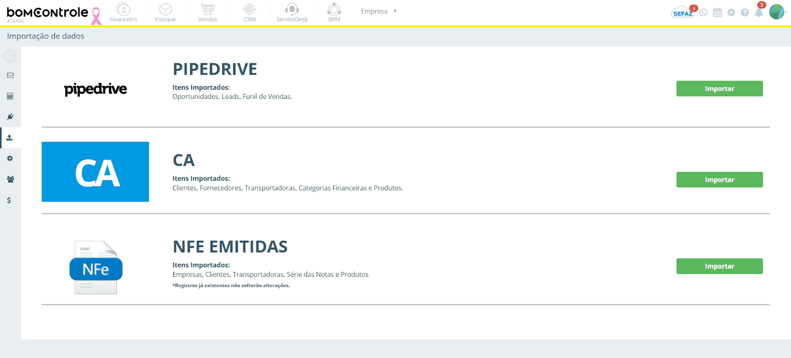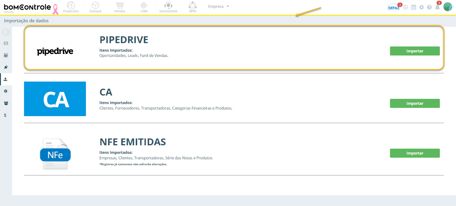 Nota: A opção Pipedrive só estará disponível se o módulo CRM do BomControle estiver habilitado para a sua empresa. Caso não veja esta seção e tenha interesse na importação do Pipedrive, verifique seu plano/contrato e habilite o módulo CRM.