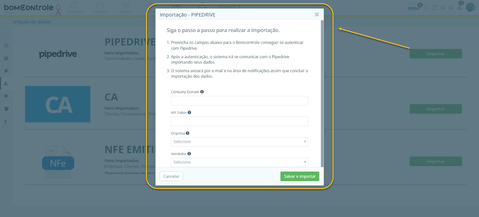 Pipedrive – importação de oportunidades, leads e funil de vendas do Pipedrive (CRM). (Visível apenas se o módulo CRM estiver habilitado em sua conta BomControle.)