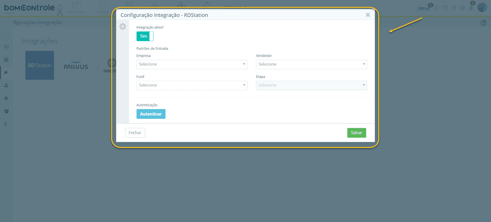 Imagem da tela de configuração da integração do BomControle com RD Station