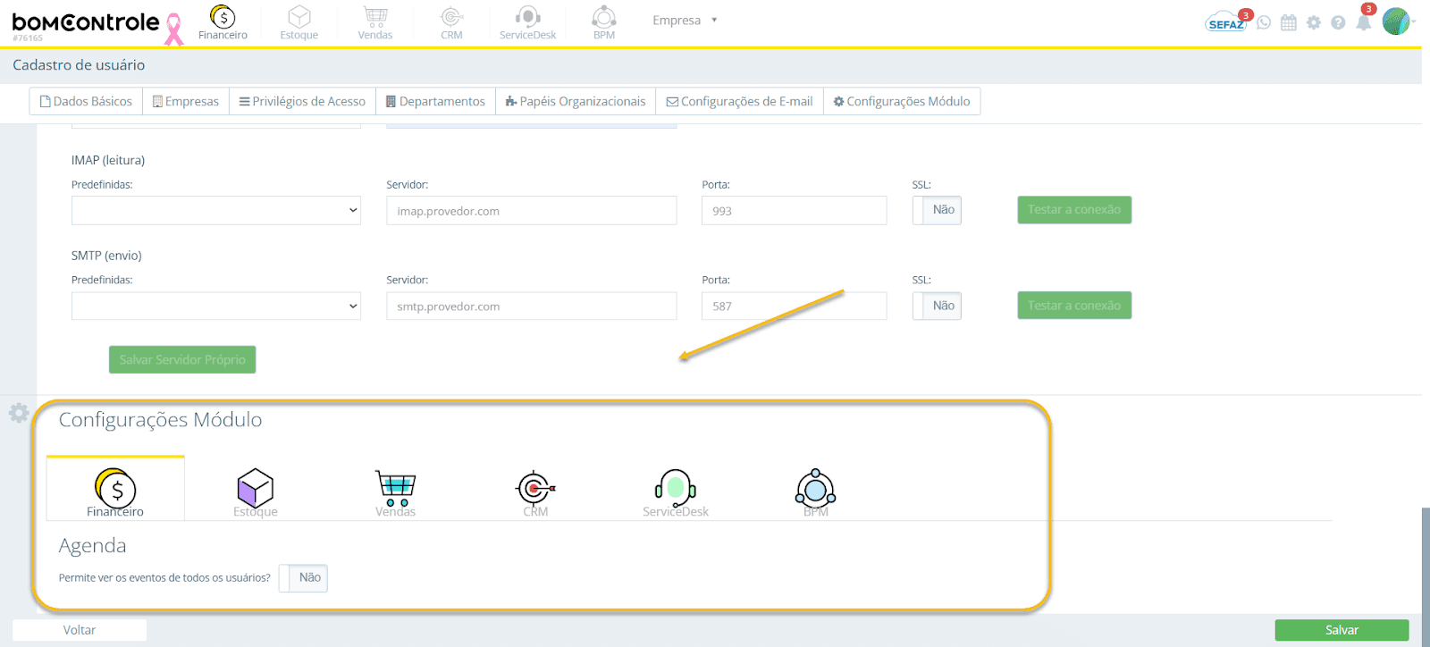 Ao marcar “Sim”, habilita-se a configuração de um servidor/caixa de e-mail específico para o usuário. Isso significa que o usuário poderá enviar e-mails a partir do BomControle com seu próprio endereço (por exemplo, enviar propostas pelo módulo CRM usando o e-mail dele em vez do genérico) e possivelmente ler e-mails recebidos diretamente no sistema, dependendo do módulo (por exemplo, um chamado de suporte do ServiceDesk poderia ser convertido em ticket a partir do e-mail dele).