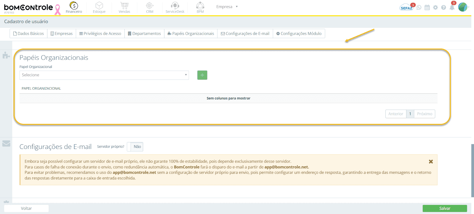 Sem configurar o servidor próprio, todas as interações por e-mail do usuário via sistema usariam um e-mail genérico (como noreply@bomcontrole...) e o usuário teria que gerenciar respostas fora do sistema.