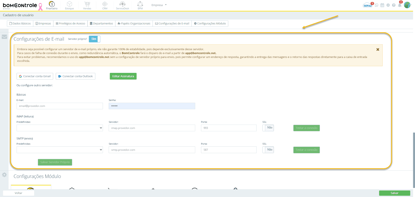 Servidor próprio? (alternância Sim/Não): Essa opção determina se o usuário usará uma conta de e-mail pessoal/corporativa integrada ao BomControle.