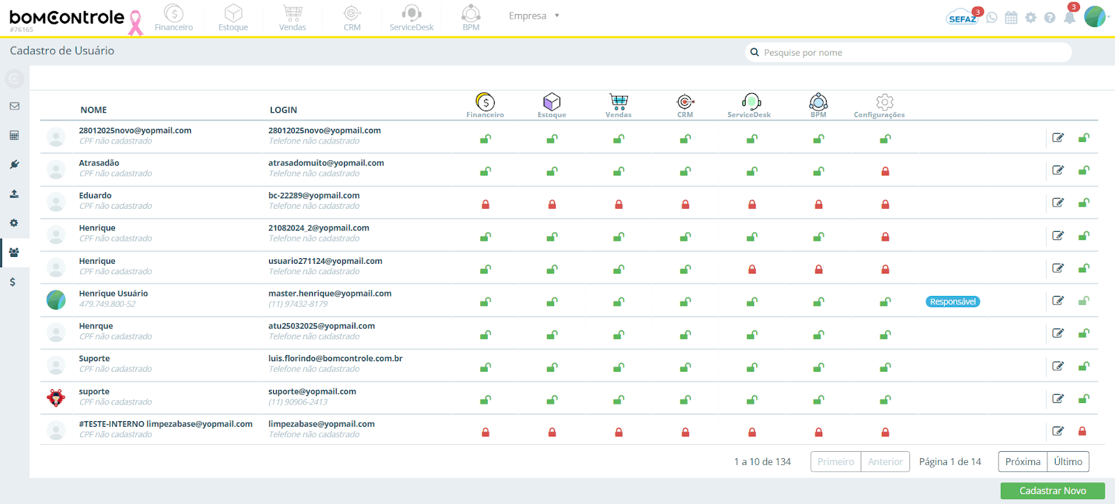 Permissões por Módulo: Após os dados de contato, a lista apresenta uma série de colunas, cada uma correspondente a um módulo do BomControle (por exemplo: Financeiro, Estoque, Vendas, CRM, ServiceDesk, BPM, Configurações, etc.). Em cada coluna há um ícone de cadeado que indica se o usuário está bloqueado ou liberado naquele módulo: