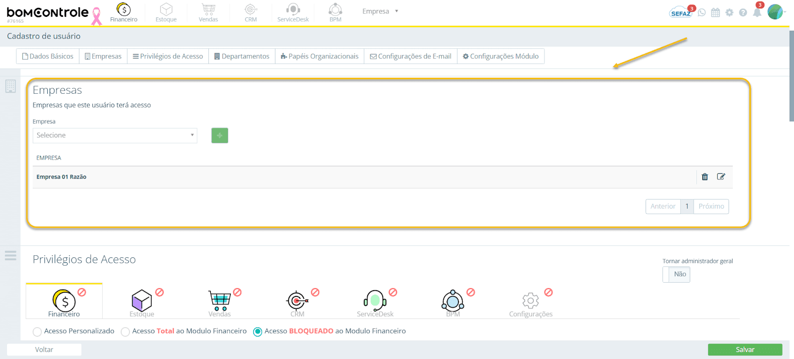 Regra: pelo menos uma empresa deve ser adicionada para usuários comuns, caso contrário ele não terá acesso a nenhum dado. Enquanto nenhuma empresa for selecionada, as demais funcionalidades (como Departamentos e Papéis) ficarão indisponíveis para o usuário.