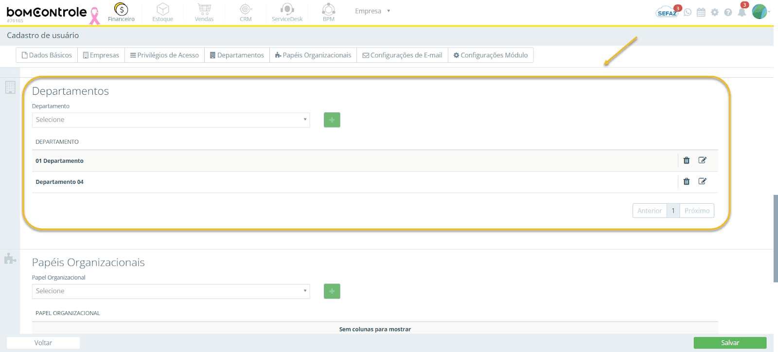 Aqui você define a quais departamentos internos o usuário pertence.