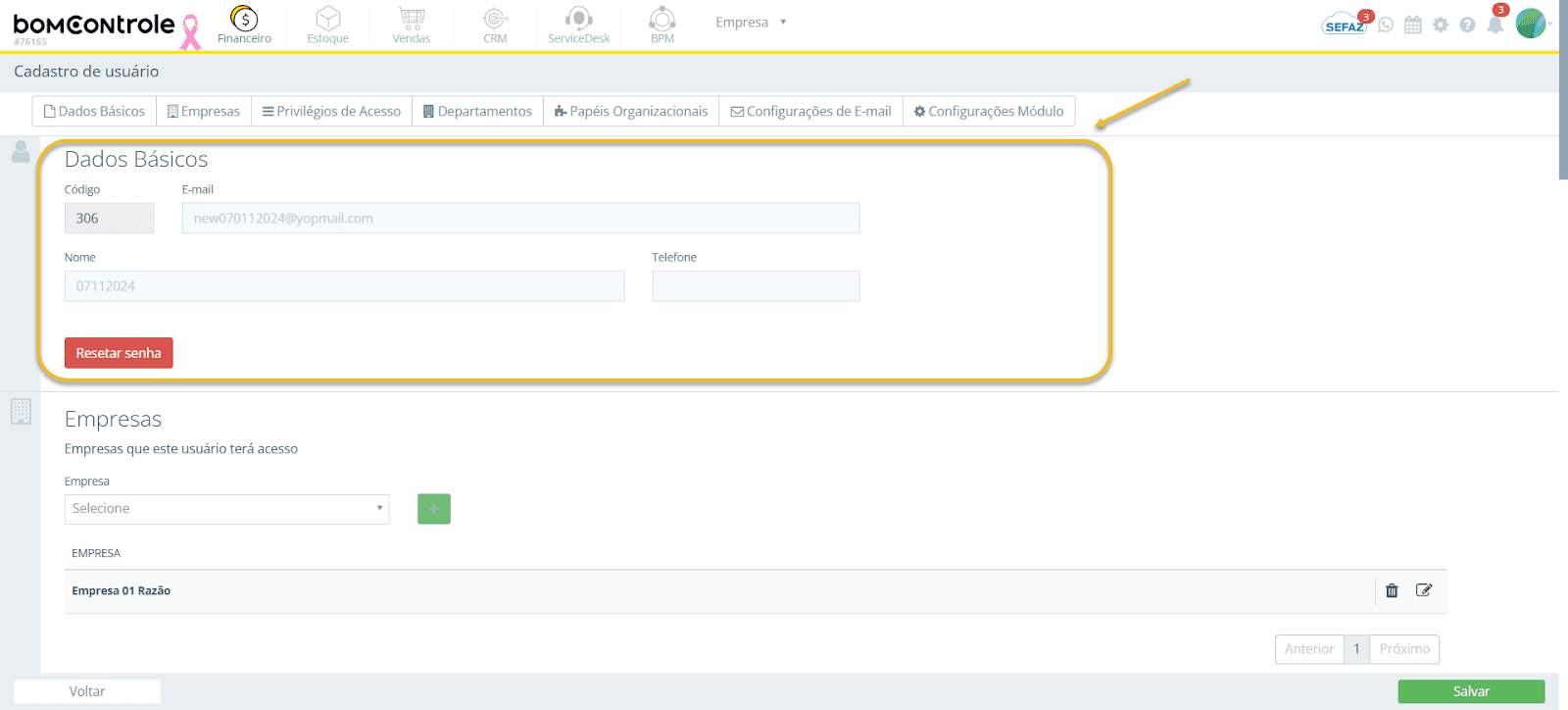 Imagem 3: Seção "Empresas" do cadastro de usuário