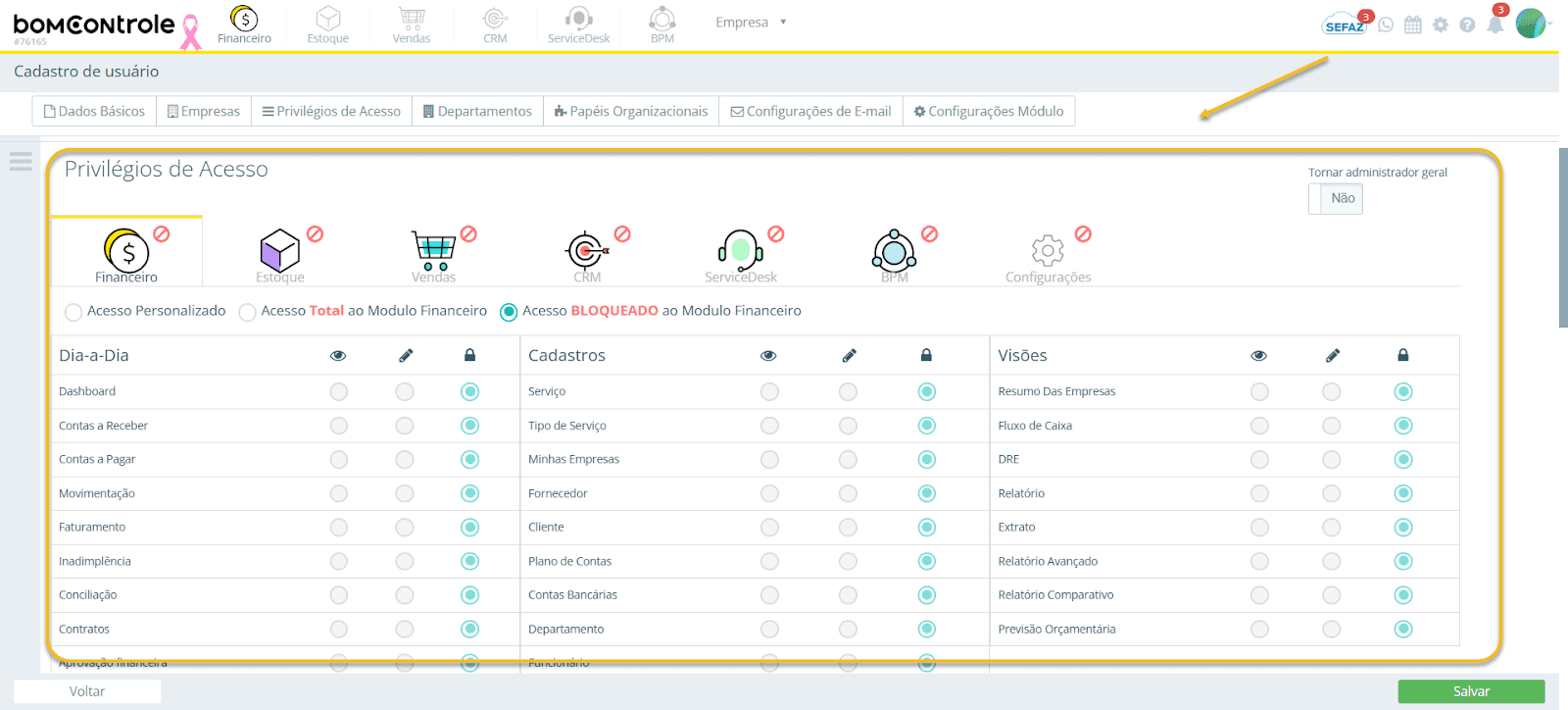 - Se bloqueado para um usuário, esse usuário não verá nada relacionado a finanças (não poderá gerar boletos, ver contas ou emitir notas fiscais de entrada, por exemplo).