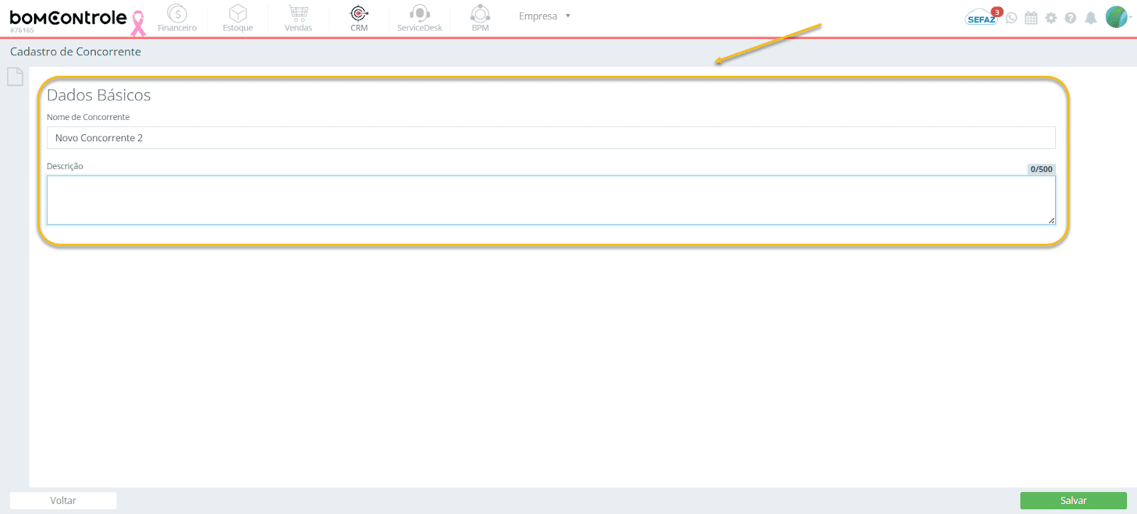 Nome de Concorrente – Defina o nome do concorrente que deseja cadastrar. Geralmente utiliza-se a razão social ou nome fantasia da empresa concorrente.