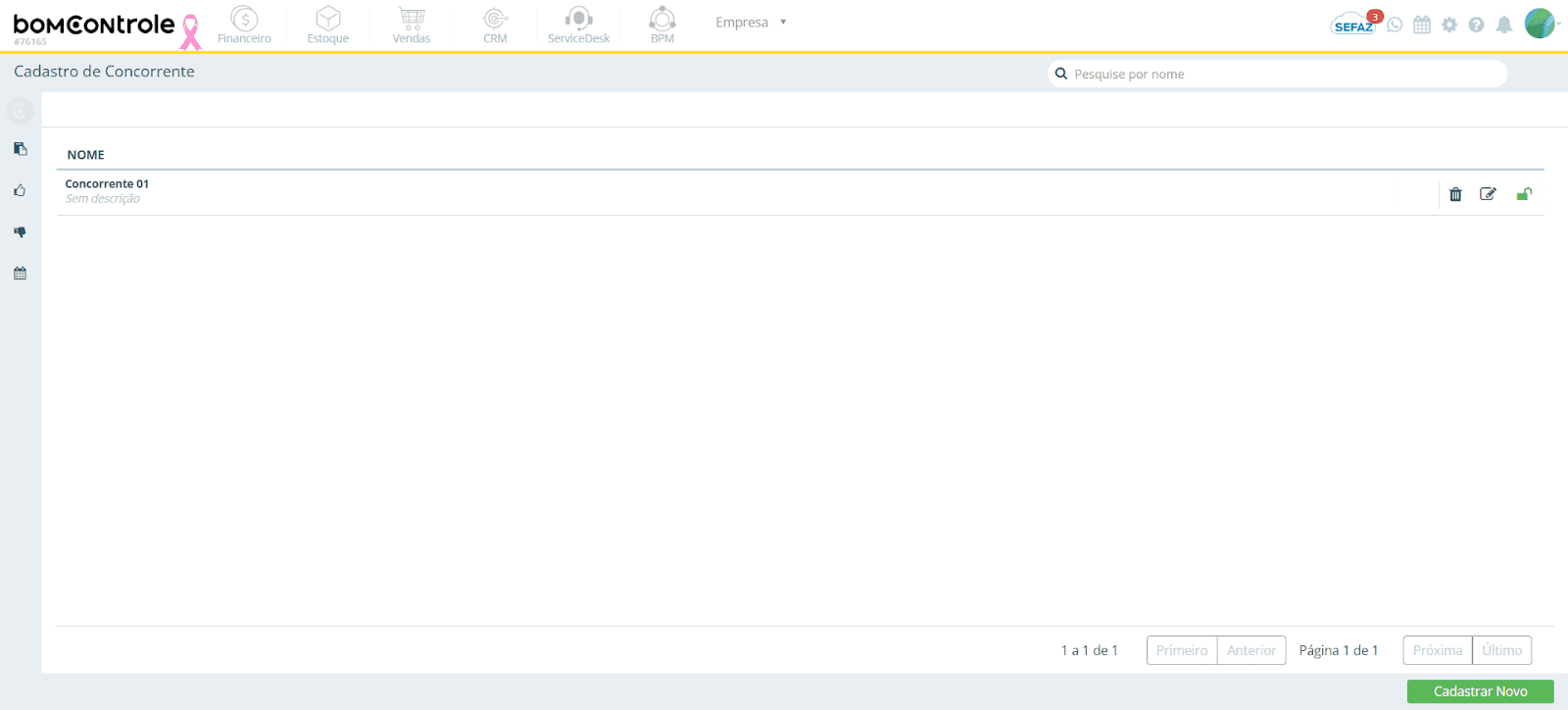 Selecione Concorrente. A tela de listagem será exibida com os concorrentes já cadastrados. Use o botão Cadastrar Novo para incluir um novo concorrente ou o ícone de lápis para editar um item existente.