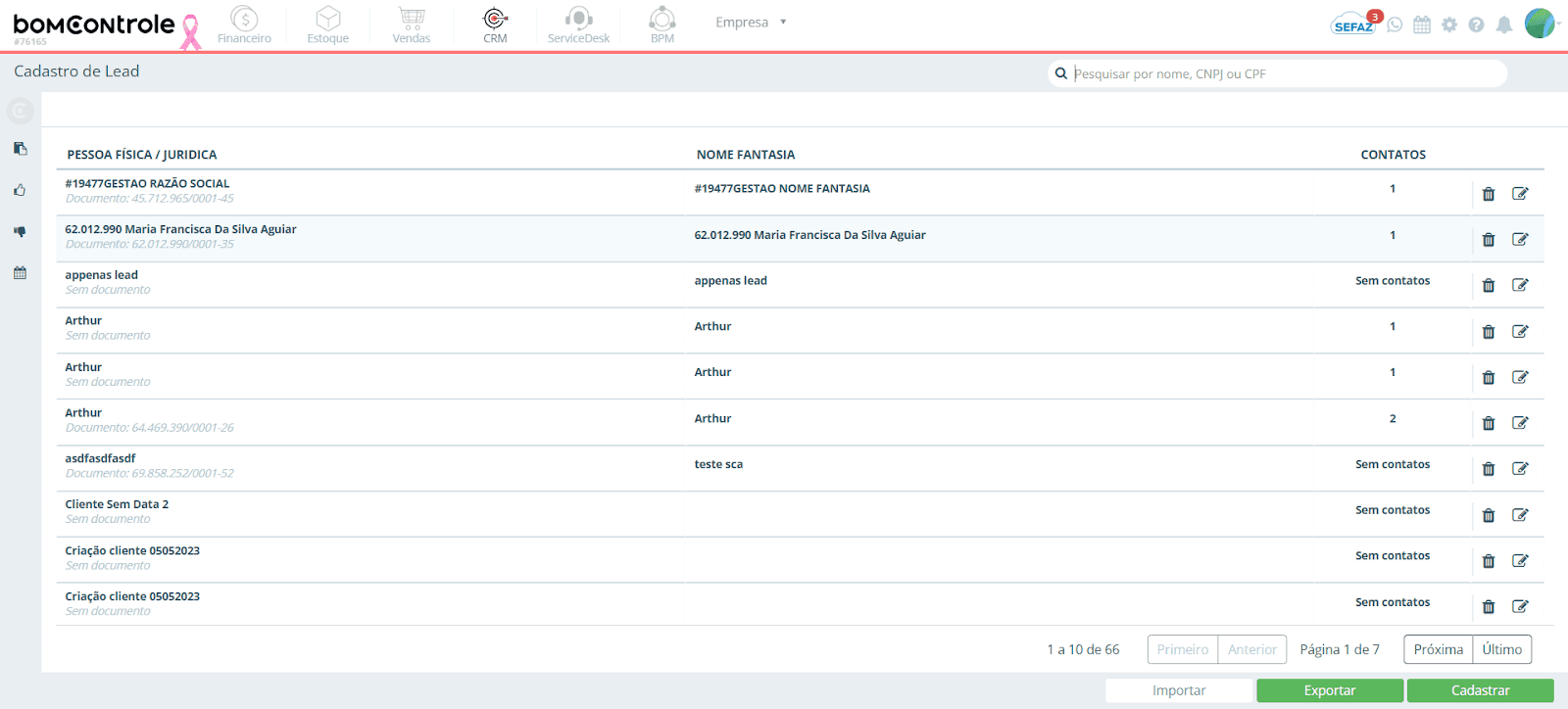 Nome Fantasia: exibido somente para leads do tipo Pessoa Jurídica, mostra o nome fantasia da empresa (ou seja, o nome comercial pelo qual a empresa é conhecida). Se o lead for pessoa física ou se a empresa não tiver um nome fantasia cadastrado, essa coluna ficará em branco ou com indicação de inexistente.