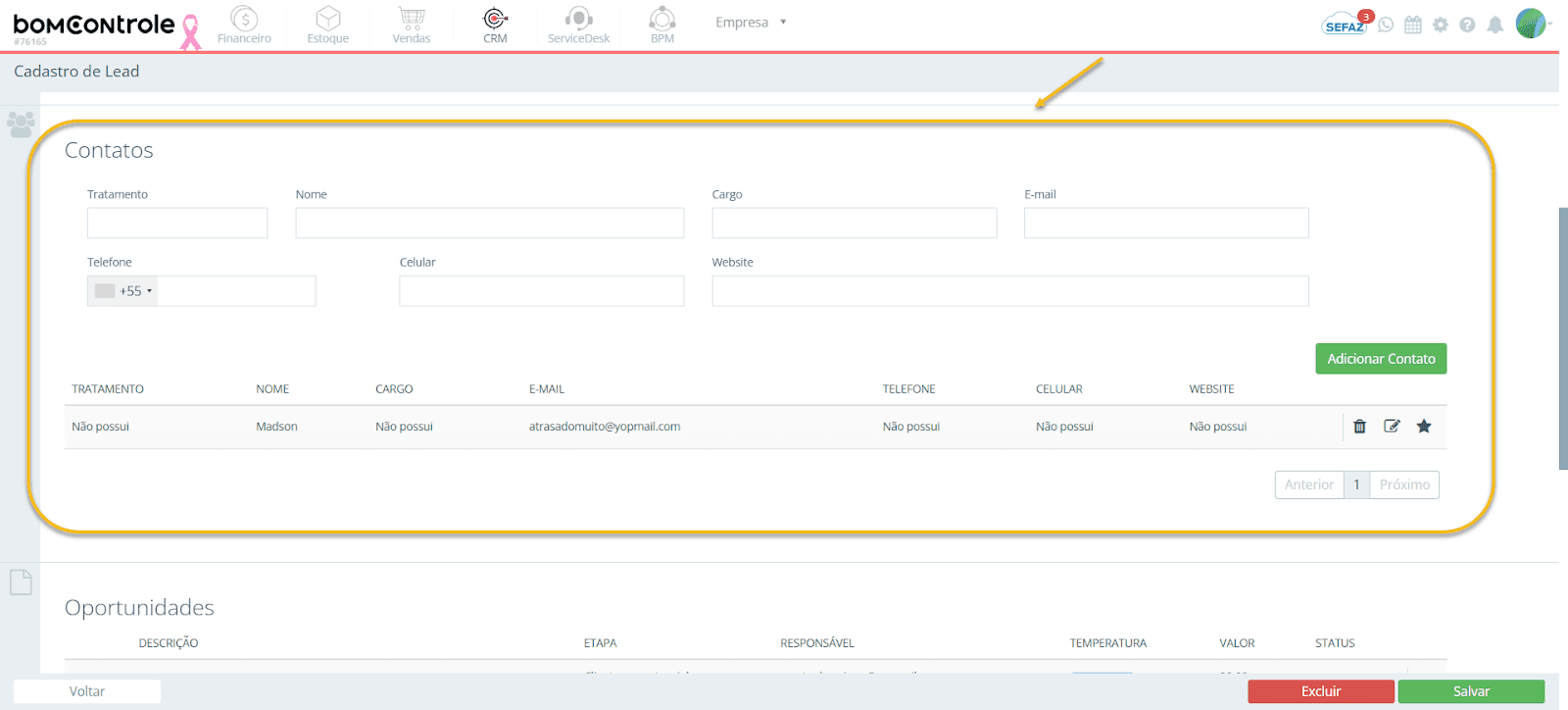 Na seção Contatos, há um pequeno formulário para adicionar um novo contato e, abaixo dele, uma tabela que lista os contatos já cadastrados para o lead. Vamos detalhar os campos para adicionar contato e as funcionalidades: