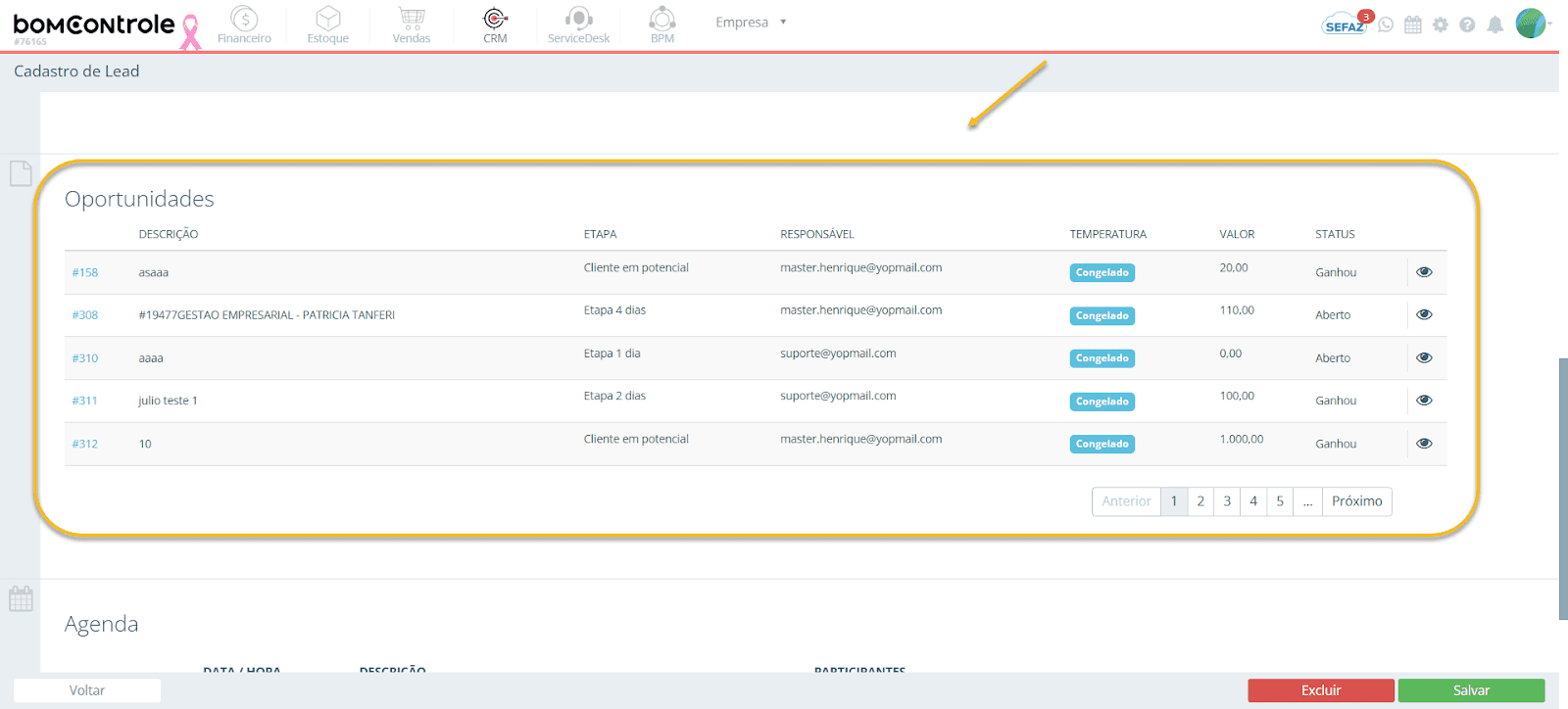 Imagem da seção “Oportunidades” dentro do cadastro de lead