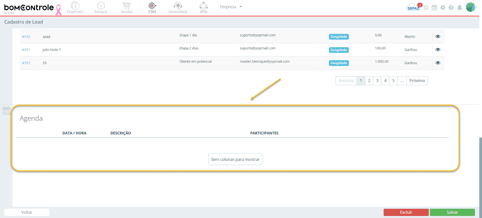 A seção Agenda exibe compromissos, tarefas ou atividades agendadas relacionadas ao lead. No processo de acompanhamento de um lead, é comum agendar ligações, reuniões, visitas ou lembretes de follow-up. O BomControle permite gerenciar essas atividades através da Agenda integrada.