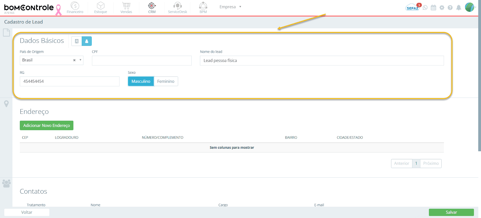 Se estiver editando um lead existente e fez alterações, clicar Voltar também descarta mudanças não salvas. Use este botão quando quiser simplesmente desistir da inclusão/edição ou navegar de volta para a lista sem realizar alterações.