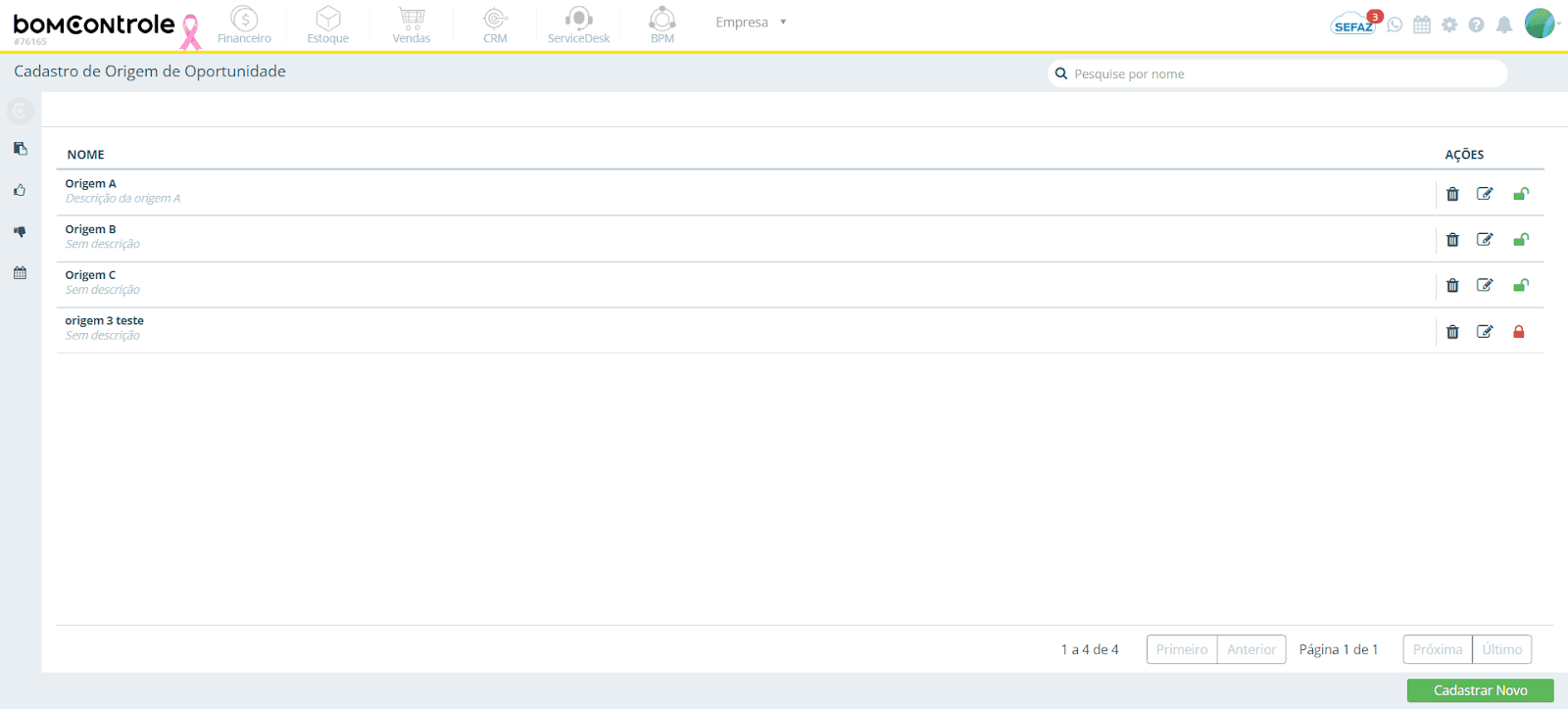 Escolha a opção Origem Oportunidade (ou Origem de Oportunidade). Será exibida a lista de origens já existentes no sistema. Para adicionar uma nova origem, clique em Cadastrar Novo. Para editar uma origem, use o ícone de lápis na linha correspondente.