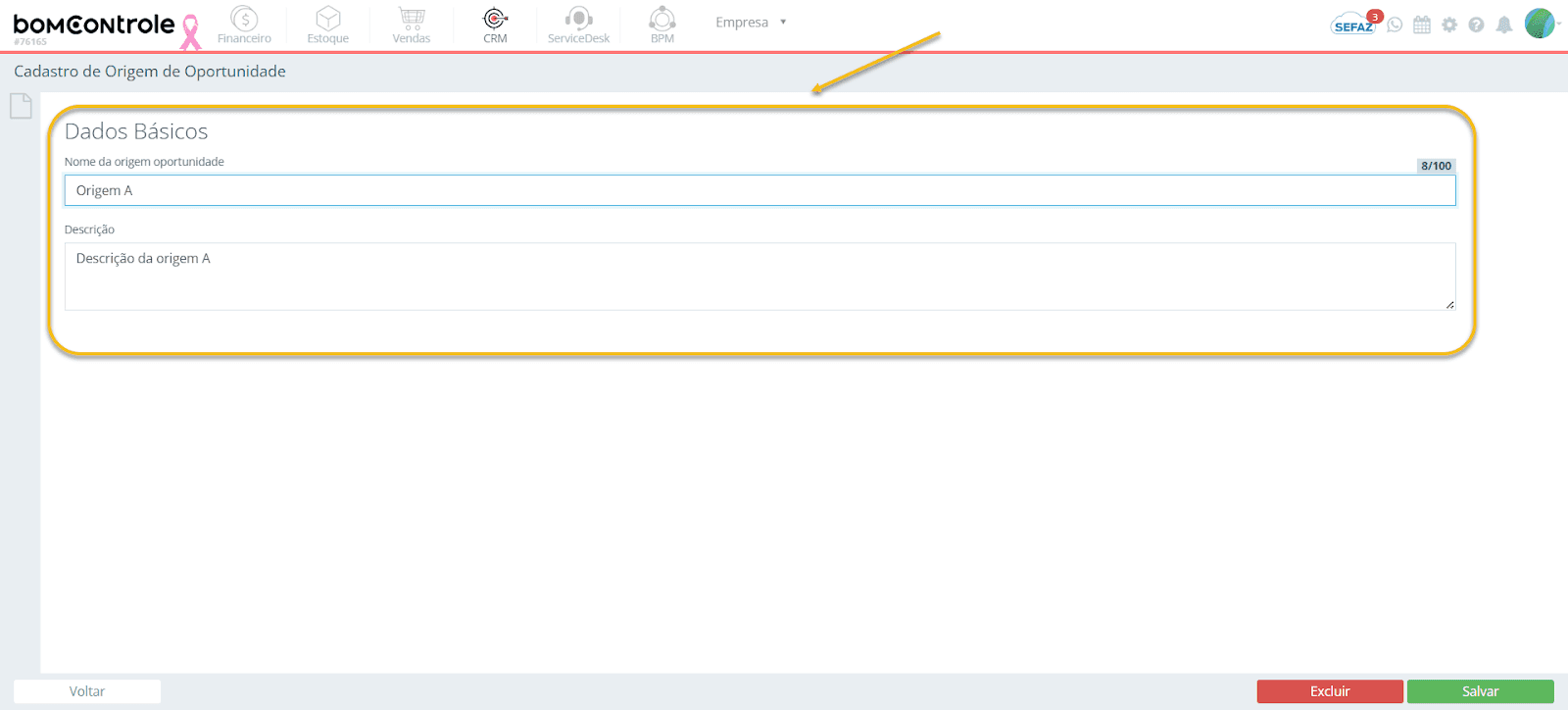 Regras: é um campo obrigatório. Não é permitido salvar uma origem sem nome. Utilize até 100 caracteres; espaços e caracteres especiais são aceitos, mas opte por nomes curtos e padronizados para facilitar o uso. Cada origem cadastrada deve ter um nome único dentro do CRM.