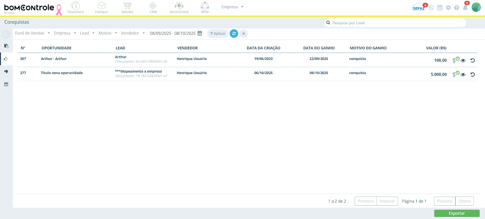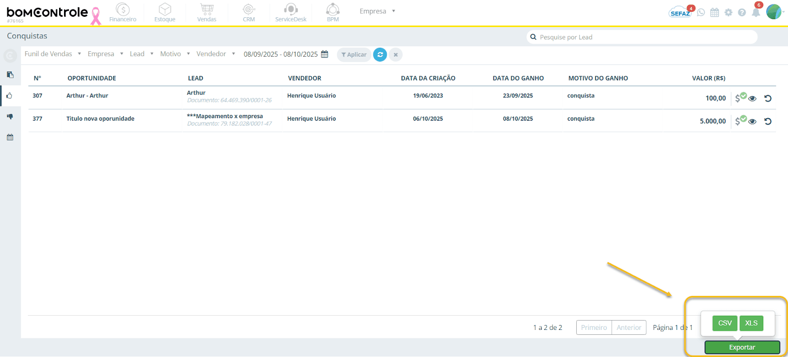 Detalhes: A planilha de exportação incluirá as colunas principais exibidas na grade (Número, Oportunidade, Empresa, Lead, Data do ganho, Motivo, Vendedor, Valor etc.), possivelmente acrescidas de informações adicionais como campos flexíveis do formulário da oportunidade, caso existam (campos personalizados preenchidos na oportunidade). Isso garante que o relatório externo seja o mais completo possível. Você pode então aplicar filtros, pivotar dados ou compartilhar esse arquivo conforme necessário para apresentações e análises.
