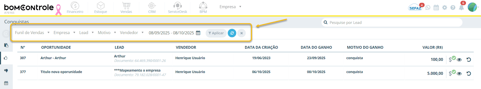 Lead: Nome do lead associado à oportunidade, ou seja, o cliente (potencial ou já existente) que foi conquistado. Esse campo mostra quem é o comprador no negócio ganho. Podem aparecer nomes de pessoas físicas (ex.: João Silva) ou de empresas (ex.: ACME Corp.), conforme o tipo de cliente cadastrado. Logo abaixo do nome do lead, a grade também exibe o documento (CPF/CNPJ) do lead, se disponível. Regras: O nome do lead vem do cadastro do cliente vinculado; o documento é exibido formatado (CPF com 11 dígitos ou CNPJ com 14 dígitos, com máscara de formatação) ou a frase "Sem documento" se não houver um CPF/CNPJ registrado para aquele lead. Observações: