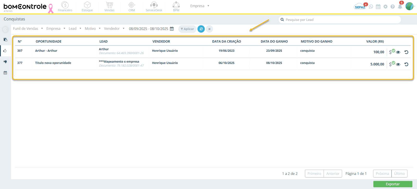 Figura 3 — Grade de resultados das Conquistas (listagem de oportunidades ganhas)