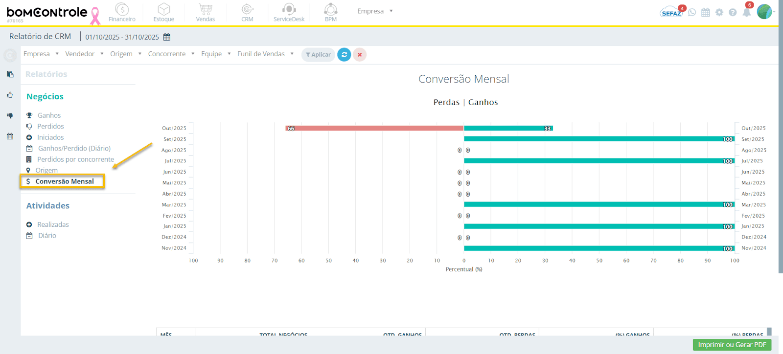 O relatório de Conversão Mensal oferece uma perspectiva de longo prazo (12 meses) sobre o desempenho do funil de vendas, comparando o número de oportunidades ganhas vs. perdidas a cada mês, bem como a taxa de conversão percentual em cada período. Em essência, ele mostra como está a evolução mensal da sua taxa de sucesso nas vendas.