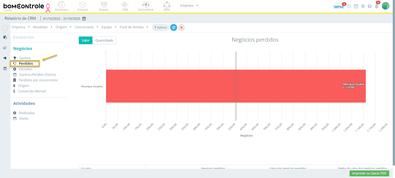 Este relatório foca nos negócios que não foram convertidos em venda, ou seja, oportunidades marcadas como “perdidas” no período selecionado. A estrutura e apresentação são semelhantes ao relatório de ganhos, mas refletindo as perdas.