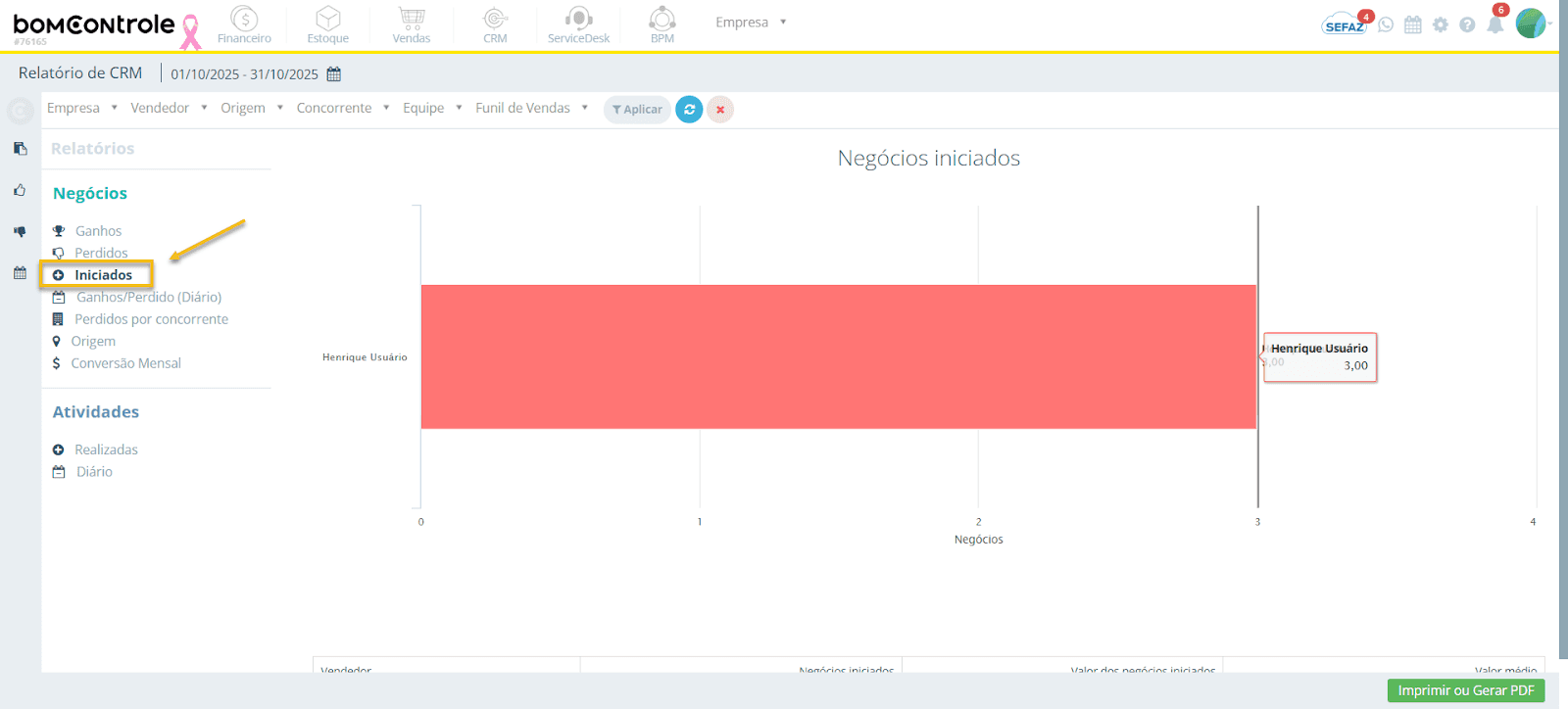 O relatório de Negócios Iniciados mostra as oportunidades que foram criadas/iniciadas no período, independentemente de estarem ganhas, perdidas ou ainda em andamento. Em outras palavras, ele indica o volume de novas oportunidades abertas em determinado intervalo de tempo, segmentado por vendedor.