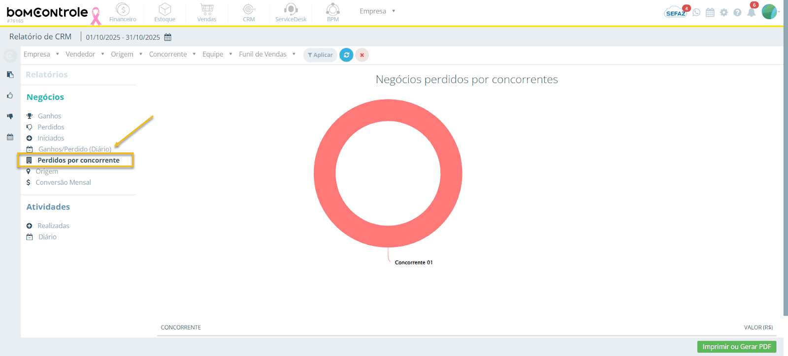 Observações: Este relatório é fundamental para análise de mercado. Ao identificar seus principais concorrentes (pela fatia de perdas), você pode direcionar estratégias para combatê-los – seja por melhora de proposta de valor, preço, negociação ou entendendo os motivos de perda. Além disso, se um concorrente específico detém a maior fatia de suas perdas, vale investigar por que: preço? funcionalidades? relacionamento? O BomControle permite registrar também o Motivo da perda; embora este relatório não detalhe motivos (apenas concorrentes), cruzar as informações pode dar insights valiosos. Importante: mantenha o cadastro de concorrentes atualizado e padronizado (evitando duplicidades de nomes, por exemplo “ACME Ltda” e “ACME” como dois cadastros diferentes), para que os dados não se fragmentem no relatório.