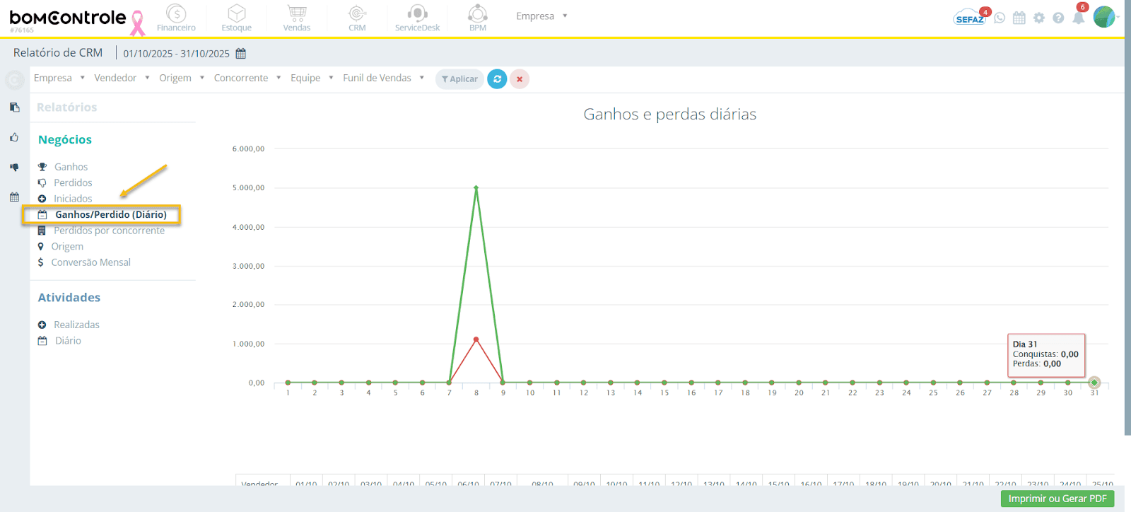 Ganhos/Perdidos (Diário) e Atividades (Diário): Devem ser executados com um único mês como intervalo. Se for selecionado um intervalo que abrange mais de um mês, o sistema focará apenas no primeiro mês do intervalo (o filtro ajusta-se para considerar somente o mês inicial).