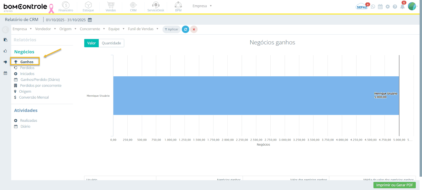 Exemplo de leitura: Se na linha do Vendedor A constar “Negócios ganhos: 3” e “Valor dos negócios ganhos: R$ 50.000” e “Média do valor: R$ 16.667”, significa que ele conquistou três oportunidades no período, somando cinquenta mil reais, com um ticket médio de ~16,7 mil por negócio.