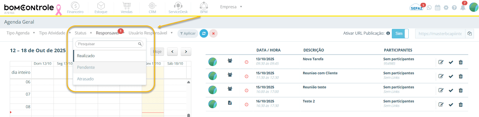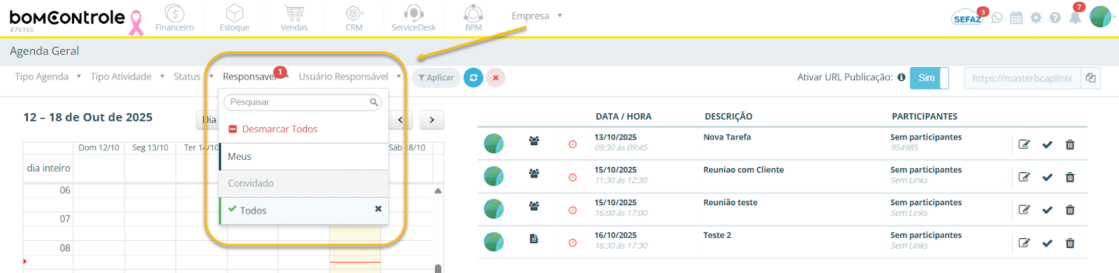 Uso: Utilize este filtro, por exemplo, para ver apenas o que já foi feito ou o que ainda está por fazer. Por padrão, ao abrir a Agenda, o filtro está em Todos.